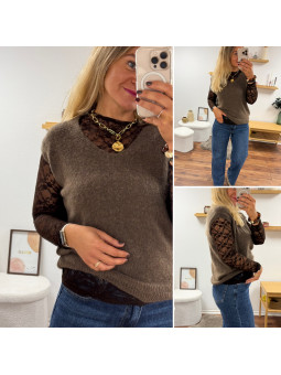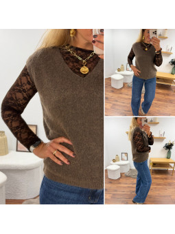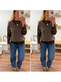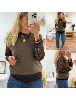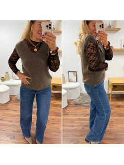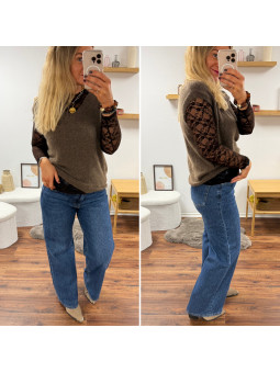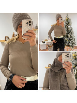 Tee shirt manches longues couleur taupe tissu côtelé avec...