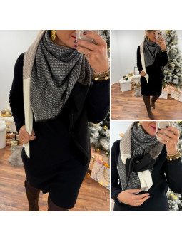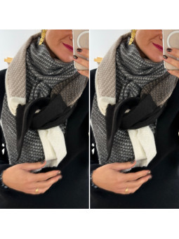 Étole épaisse en triangle taupe, écrue, noir et chocolat 65%...