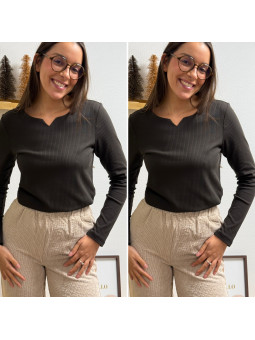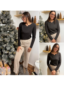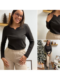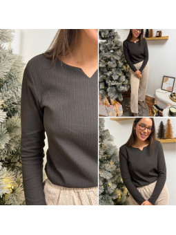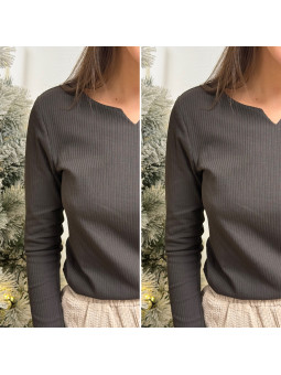 Tee shirt manches longues chocolat tissu côtelé avec petit col...