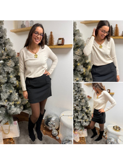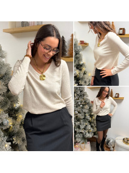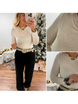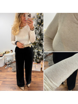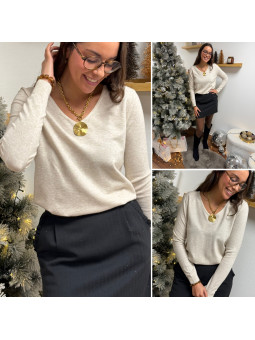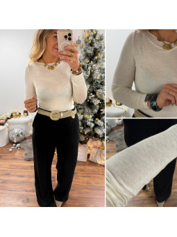 Tee shirt à manches longues fin beige en cachemire avec points...