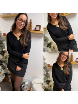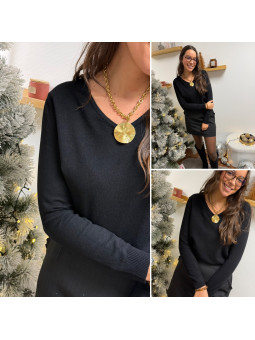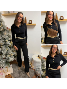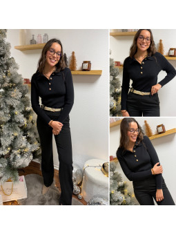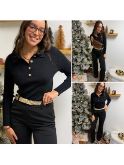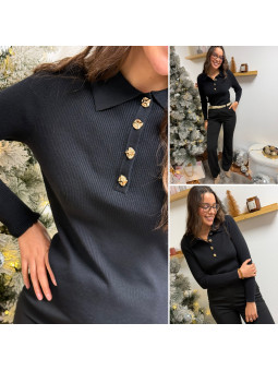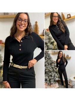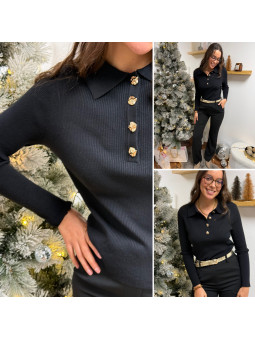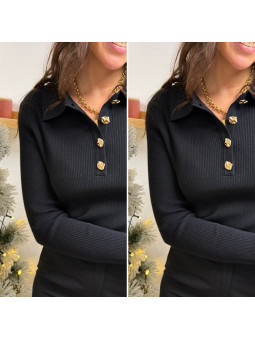 Pull col polo noir en mailles côtelées avec boutons dorés Le...