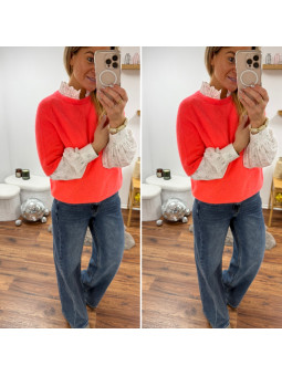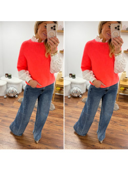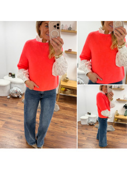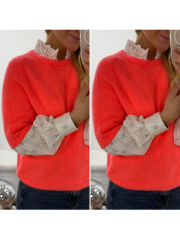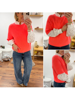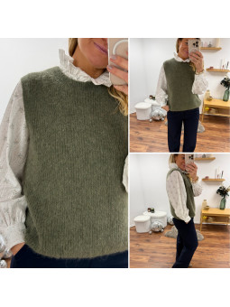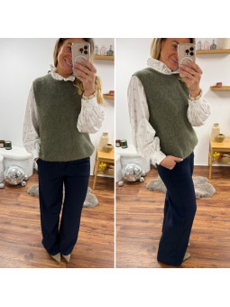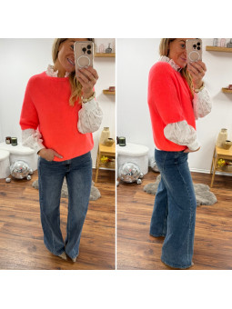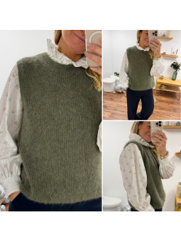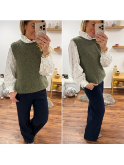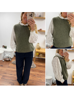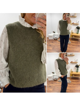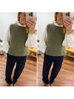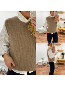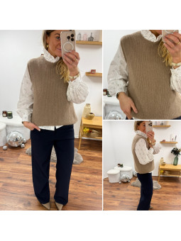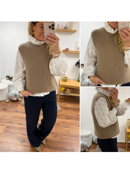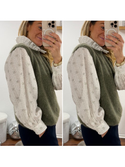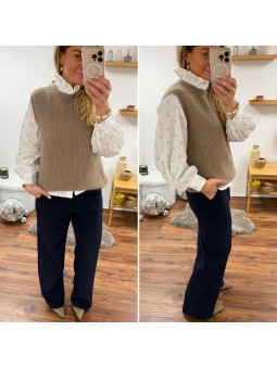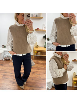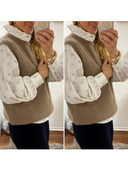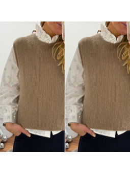 Pull chocolat avec bijoux en strass argentés sur le col Cet...