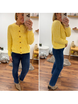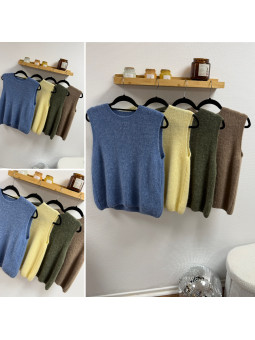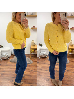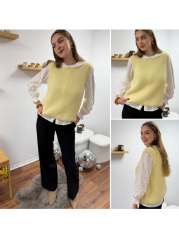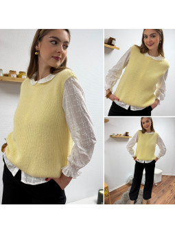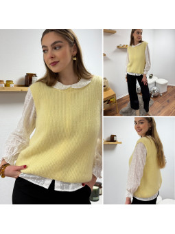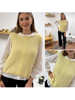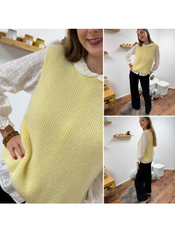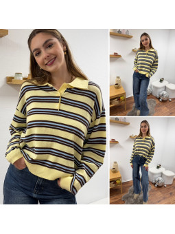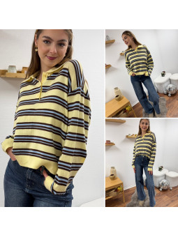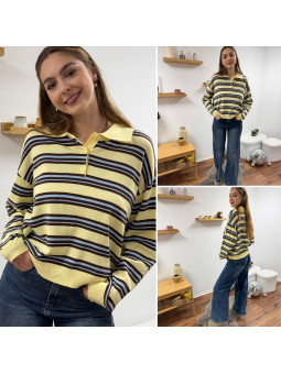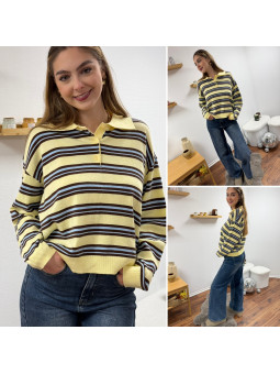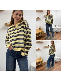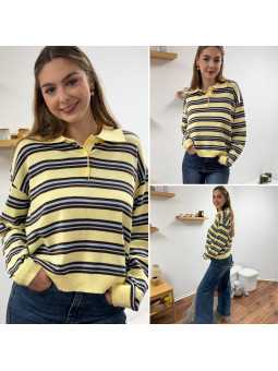 Pull polo jaune pastel avec rayures chocolat et bleu Le SM...