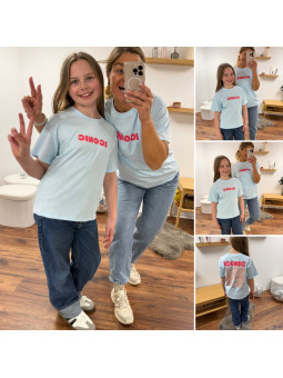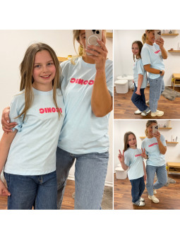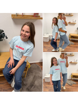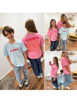 Tee-shirt adulte bleu ciel "iconic" avec écritures roses et...