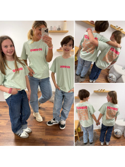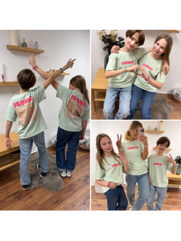 Tee-shirt adulte vert amande "iconic" avec écritures roses et...