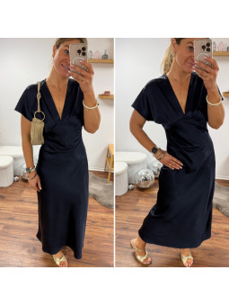 Robe longue bleu marine satinée col V ajustée à la taille Le S...