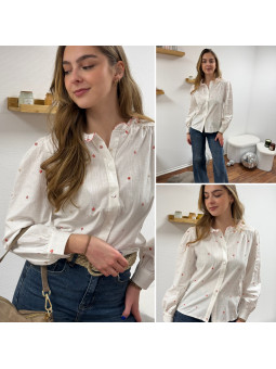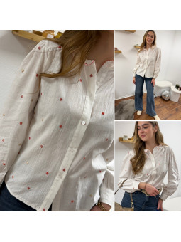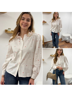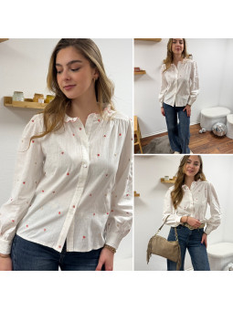 Chemise blanche avec petits coeurs dorés et framboises et col...