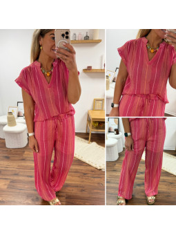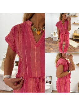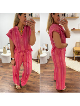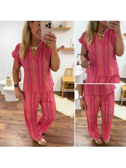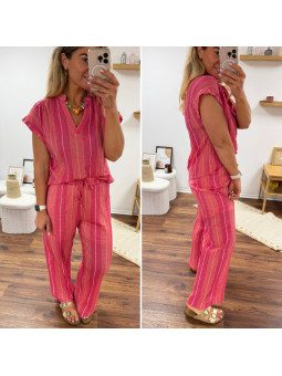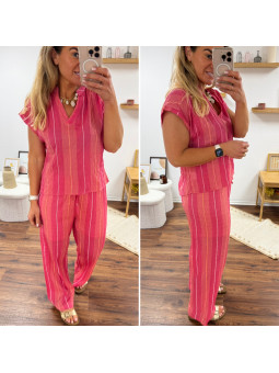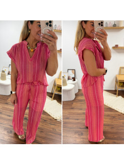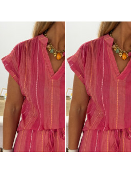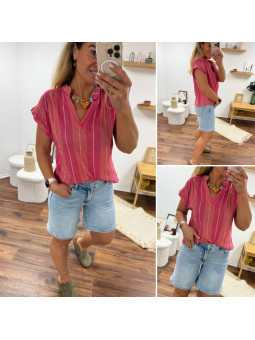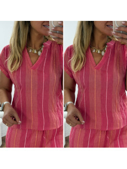 Blouse manches courtes rose framboise avec rayures blanches et...