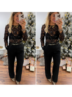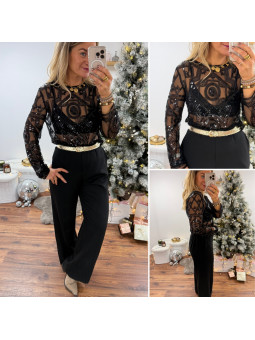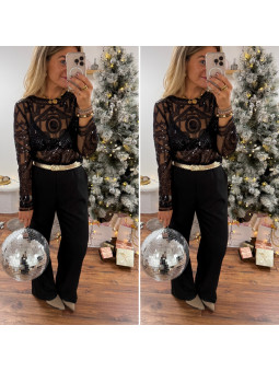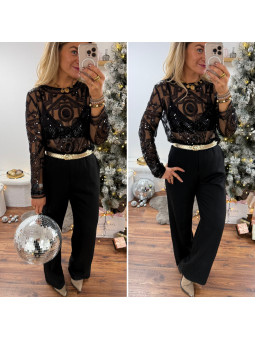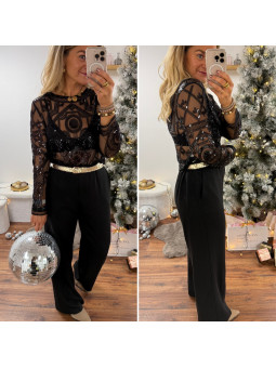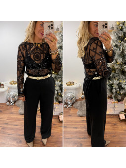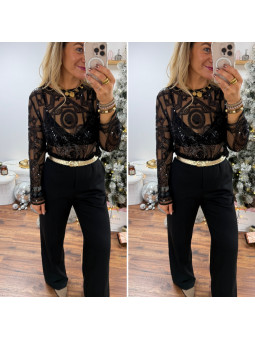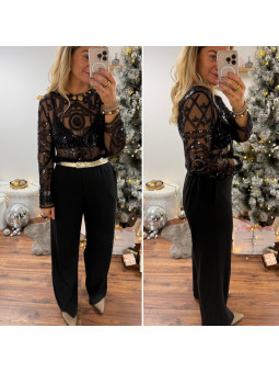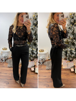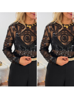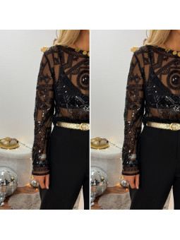 Blouse noire en voile avec motifs en perles et sequins Le SM...