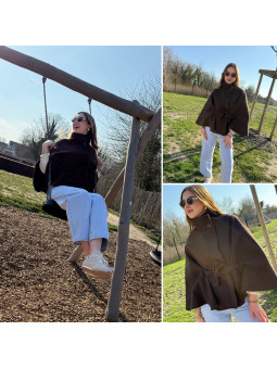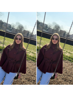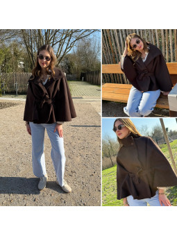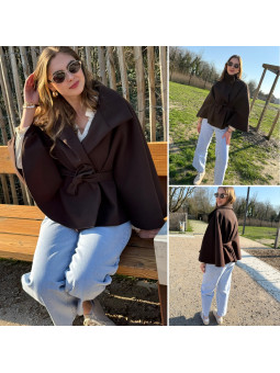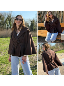 Veste cape chocolat avec col montant et ceinture à la taille...