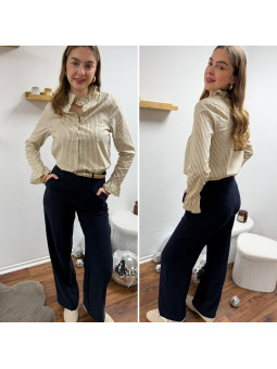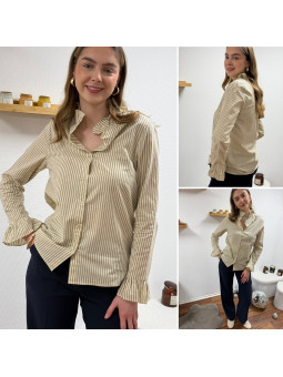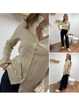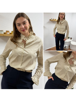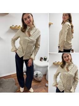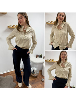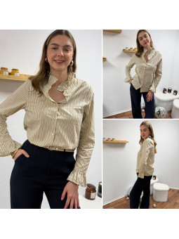 Chemise écrue à rayures grises et taupes avec col volant Le SM...