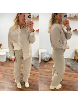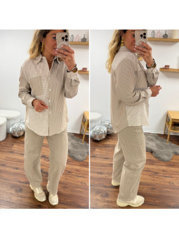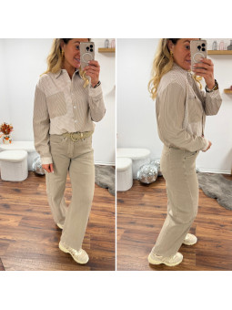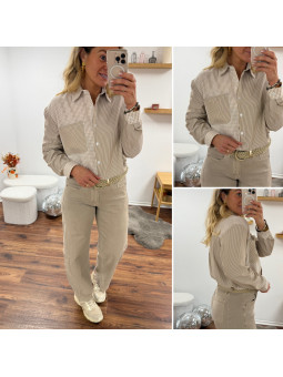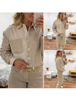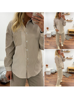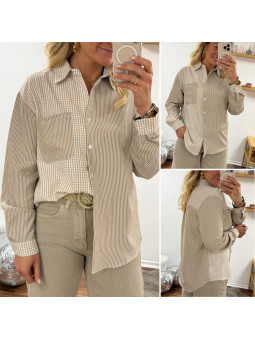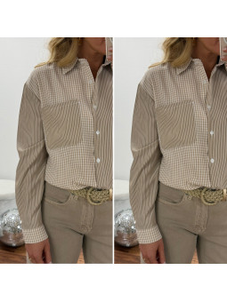 Chemise beige et taupe avec un côté rayé et un côté carreaux...