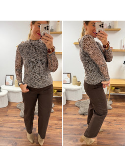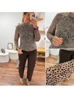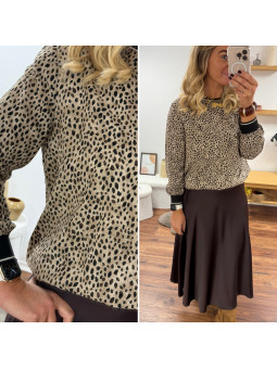 Blouse beige avec petit léopard tacheté resserrée aux poignets...