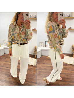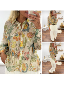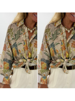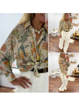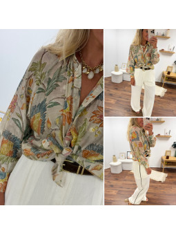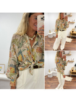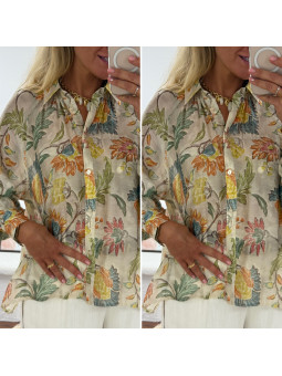 Chemise fluide beige imprimé bohème aux tons naturels verts et...