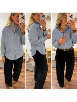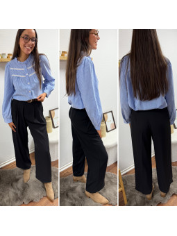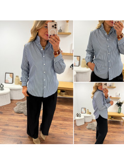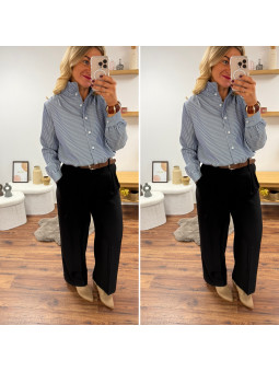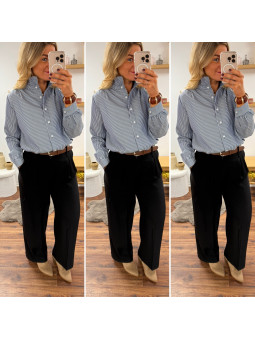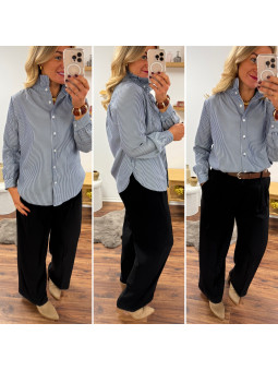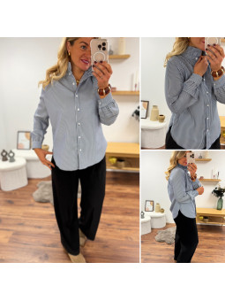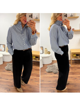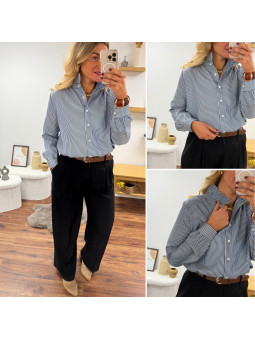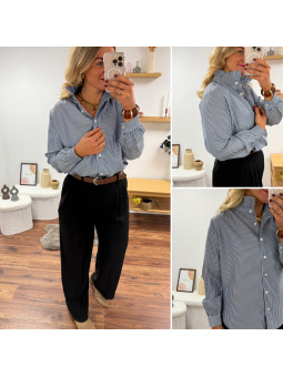 Blouse bleue foncée avec fines rayures blanches et col volant...