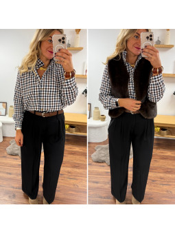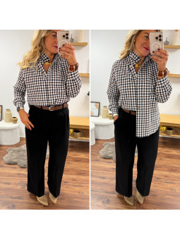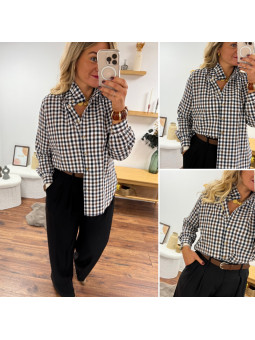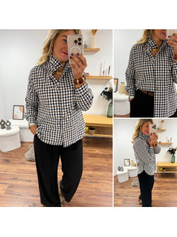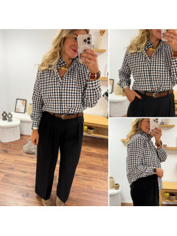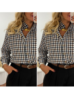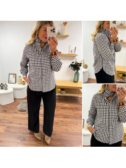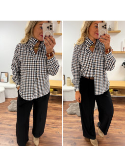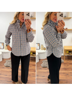 Blouse à petits carreaux chocolat et marine avec col volant Le...