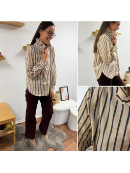 Blouse beige avec col volant à lignes marines avec fin contour...
