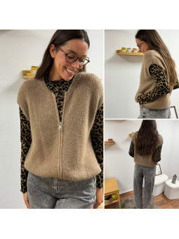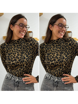 Blouse beige avec petit léopard tacheté resserrée aux poignets...