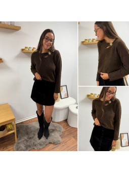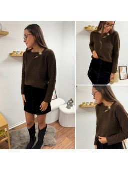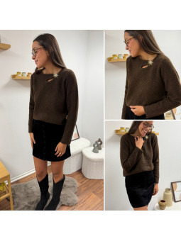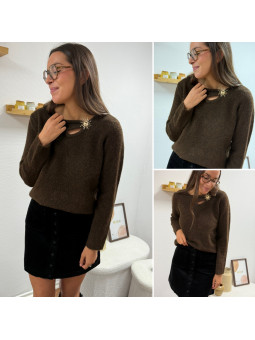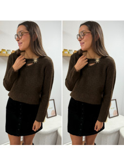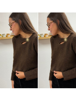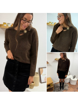 Pull chocolat avec soleil doré et ouverture sur le col Cet...