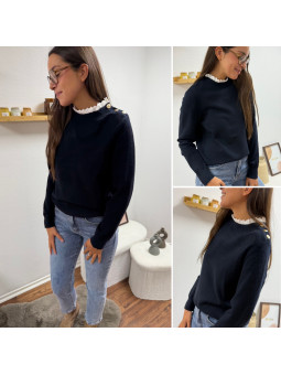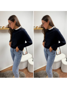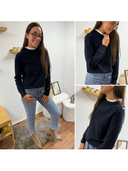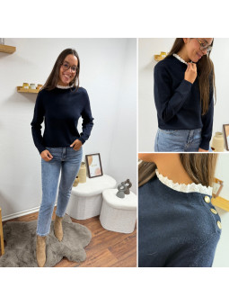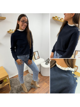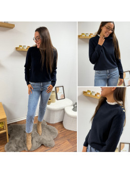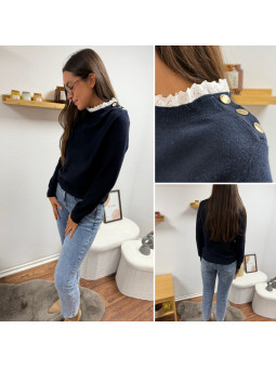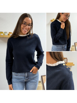 Pull bleu marine avec col en broderies blanches et boutons...