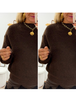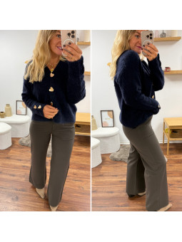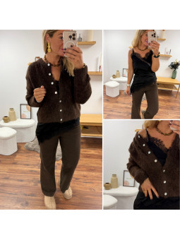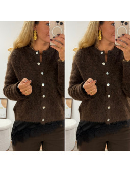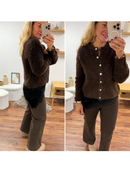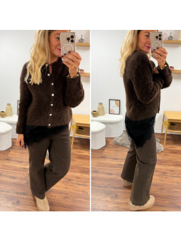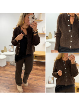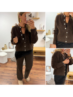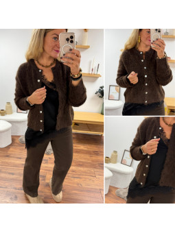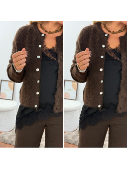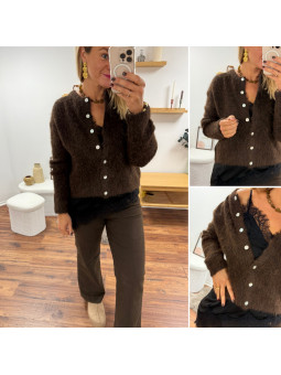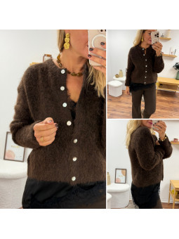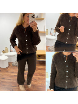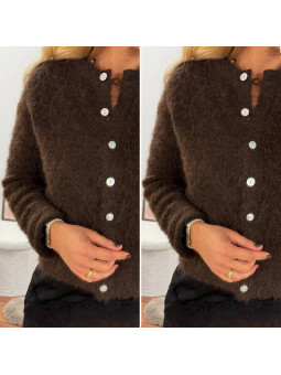 Gilet col rond chocolat avec boutons nacrés maille fluffy Cet...