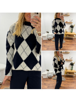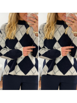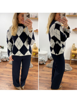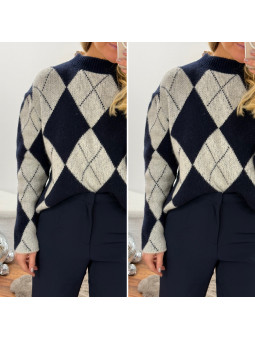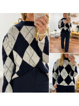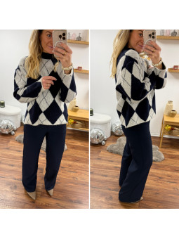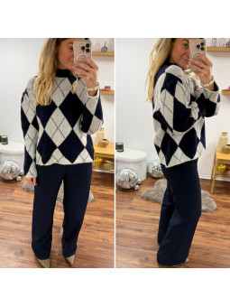 Pull jacquard avec losanges bleu marine et blanc 10% laine, 6%...