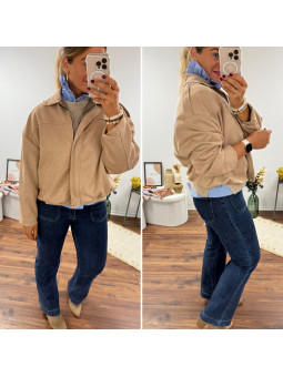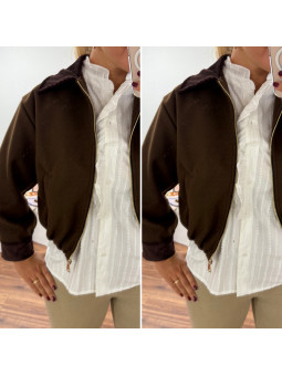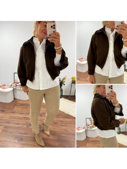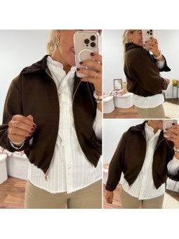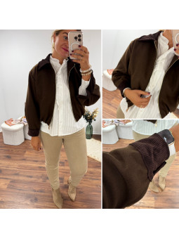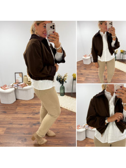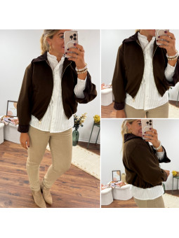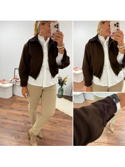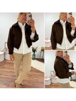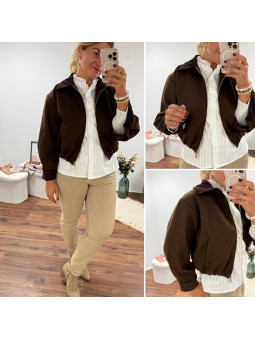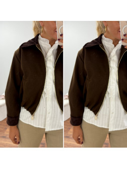 Veste courte chocolat froncée dans le bas avec col et poignets...