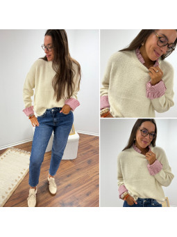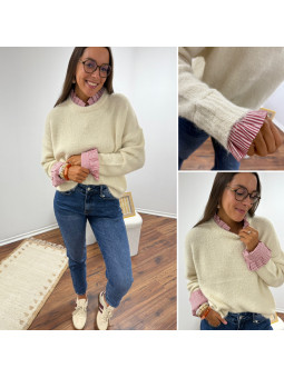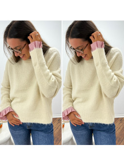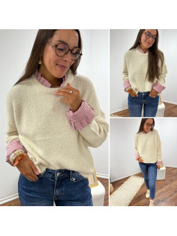 Pull écru à faux col et bas de manches rayés rouge et blanc...