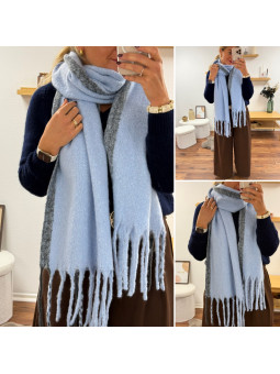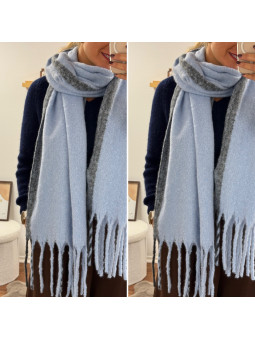 Grosse écharpe bleu clair toute douce avec bord gris et...