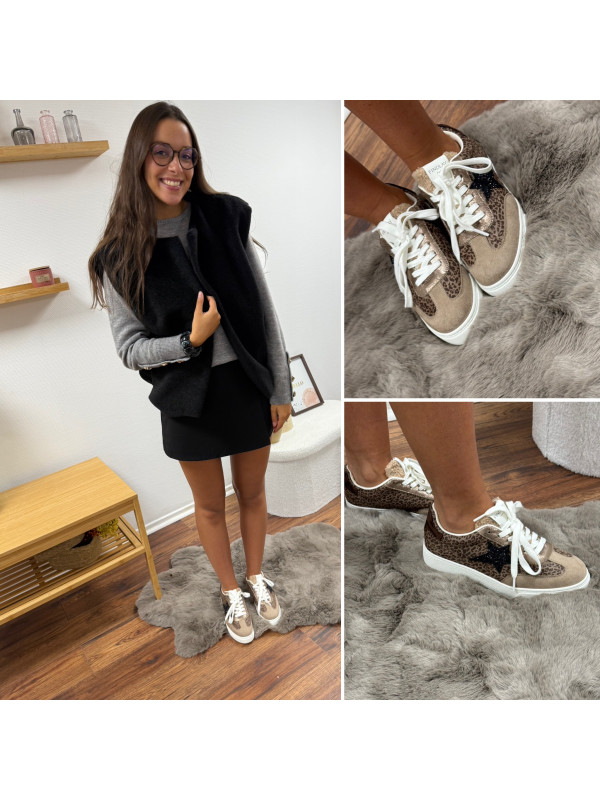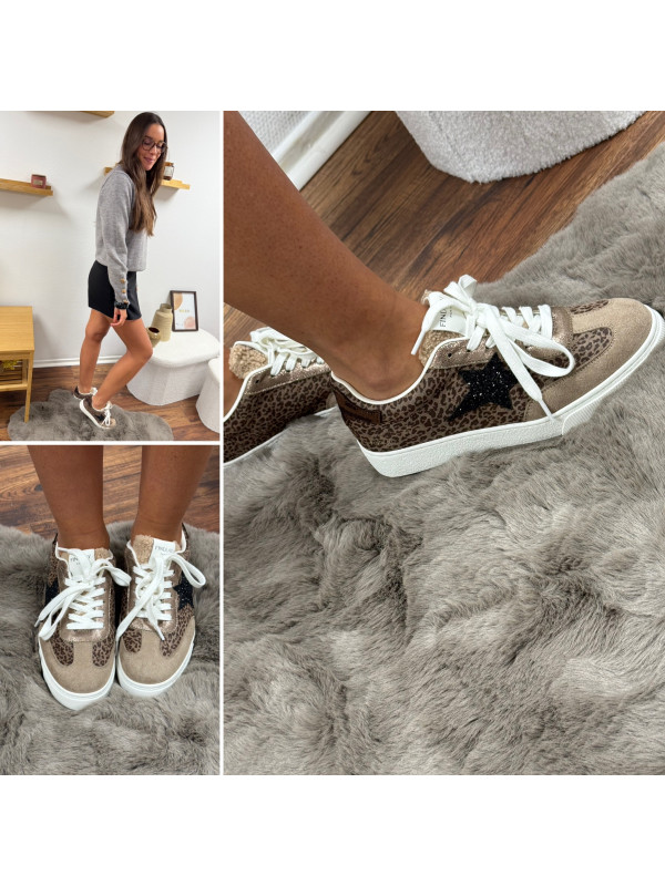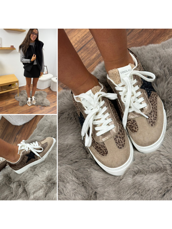 Baskets léopard avec étoile pailletée noire et empiècements en sherpa et suédine taupe