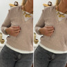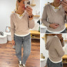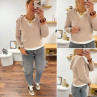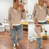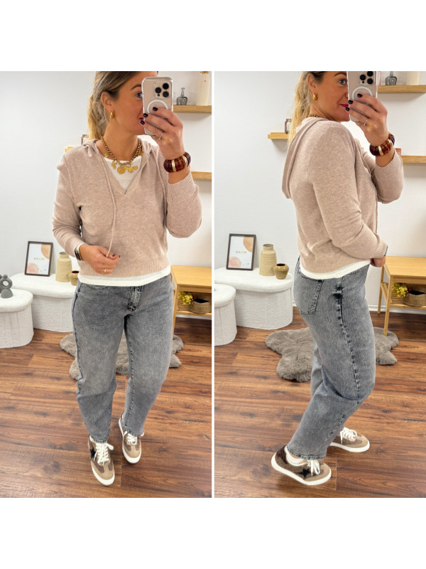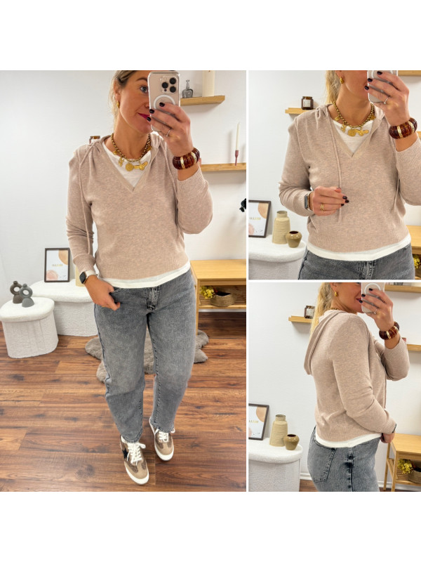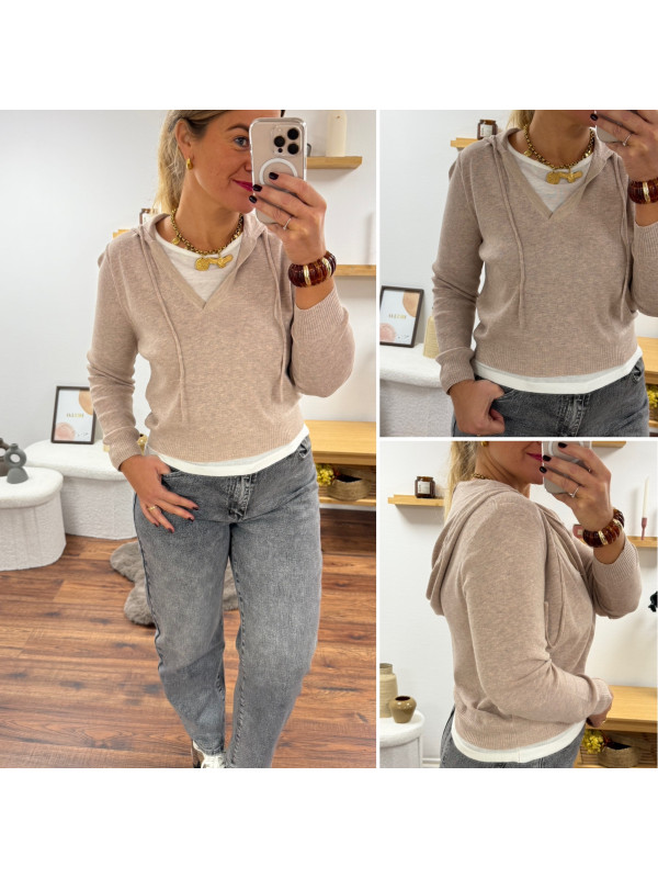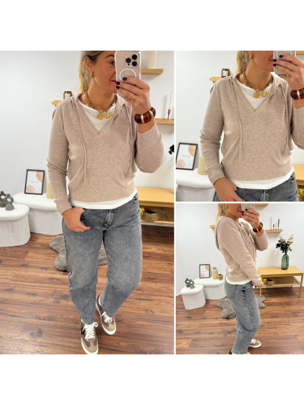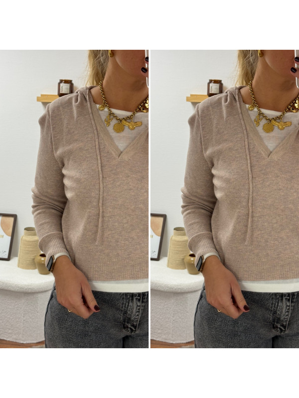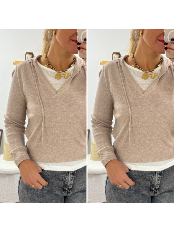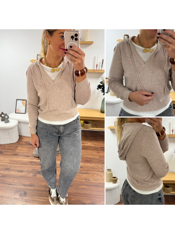 Pull léger à capuche taupe clair chiné avec empiècements façon tee shirt blanc intégré