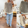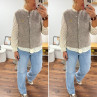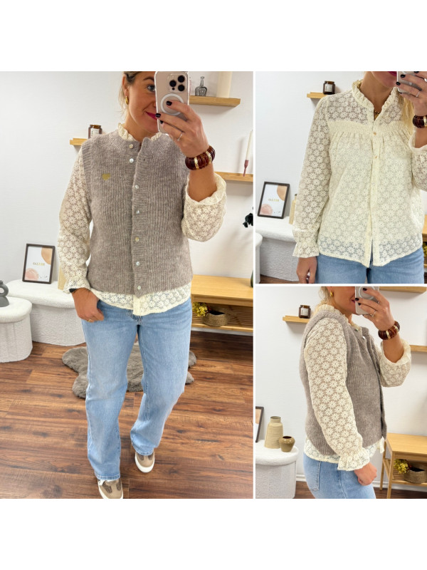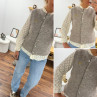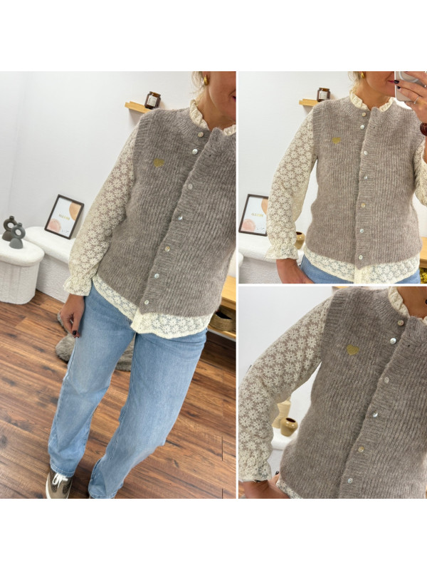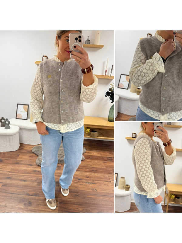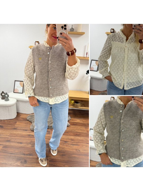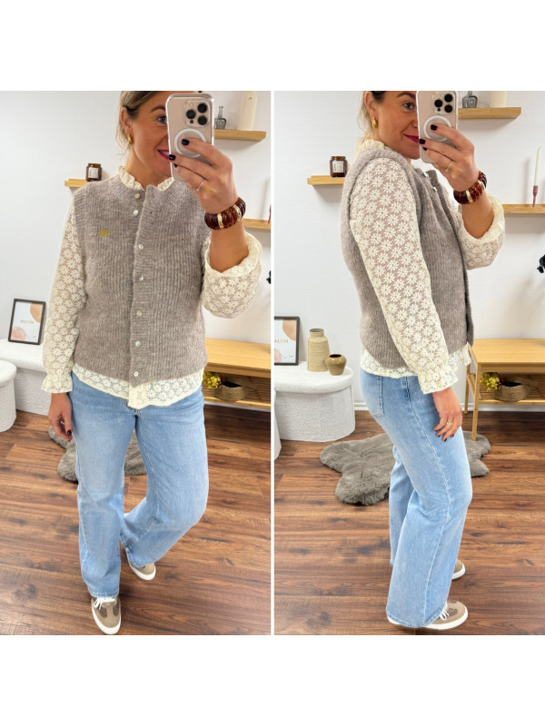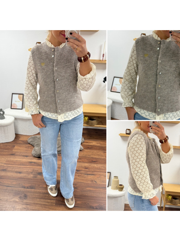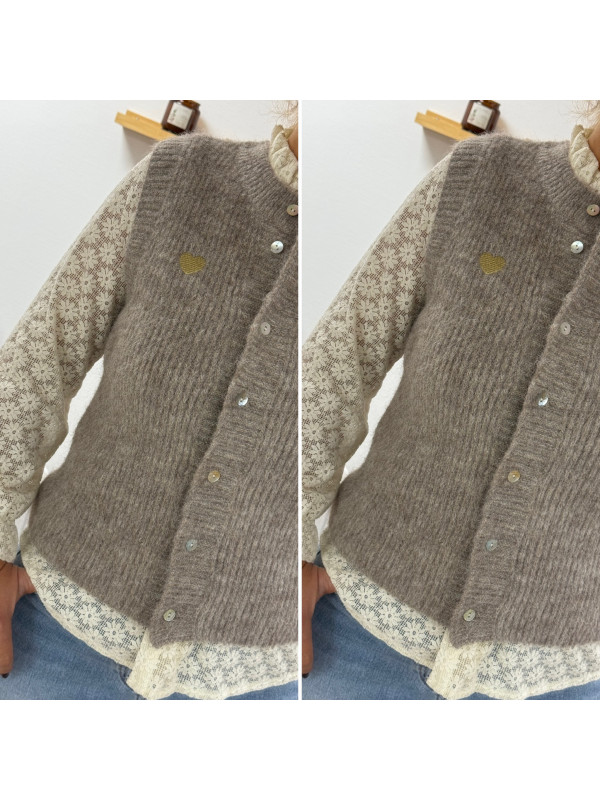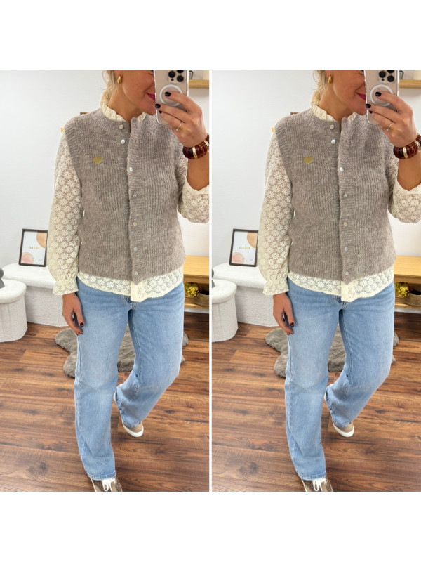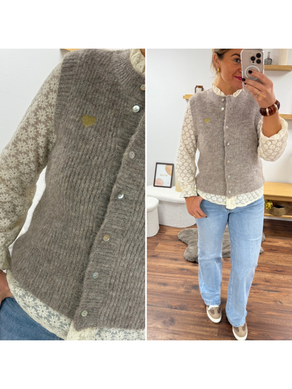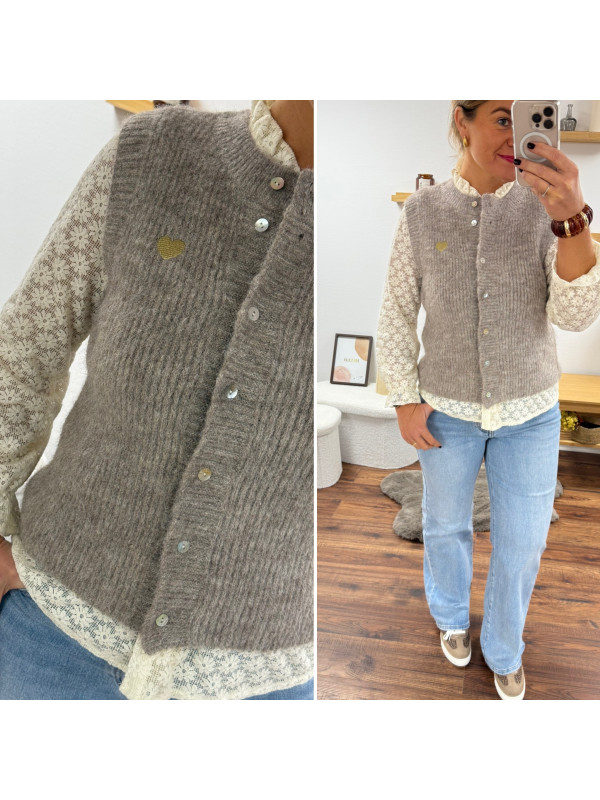 Gilet sans manches avec coeur doré et boutons nacrés taupe chiné