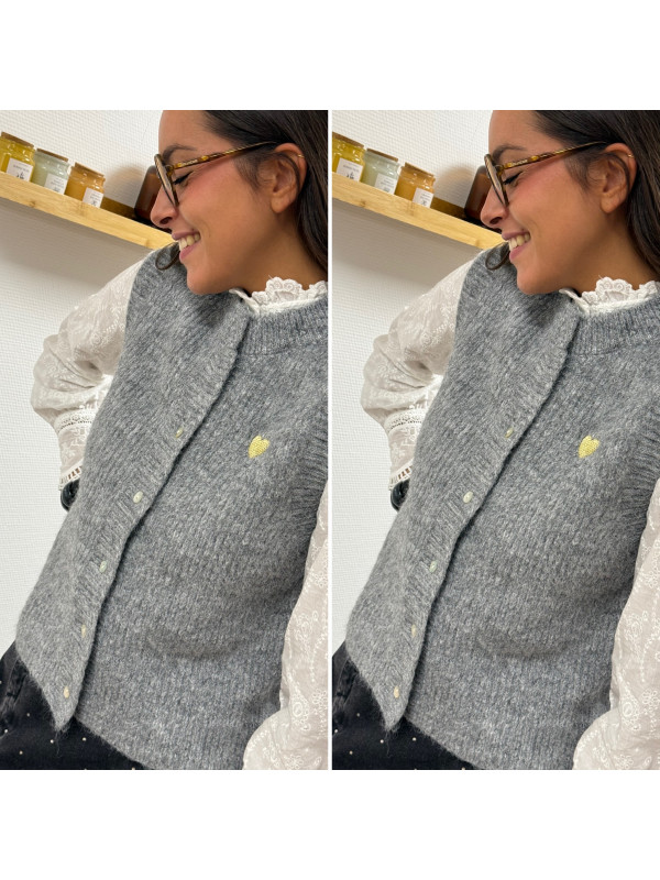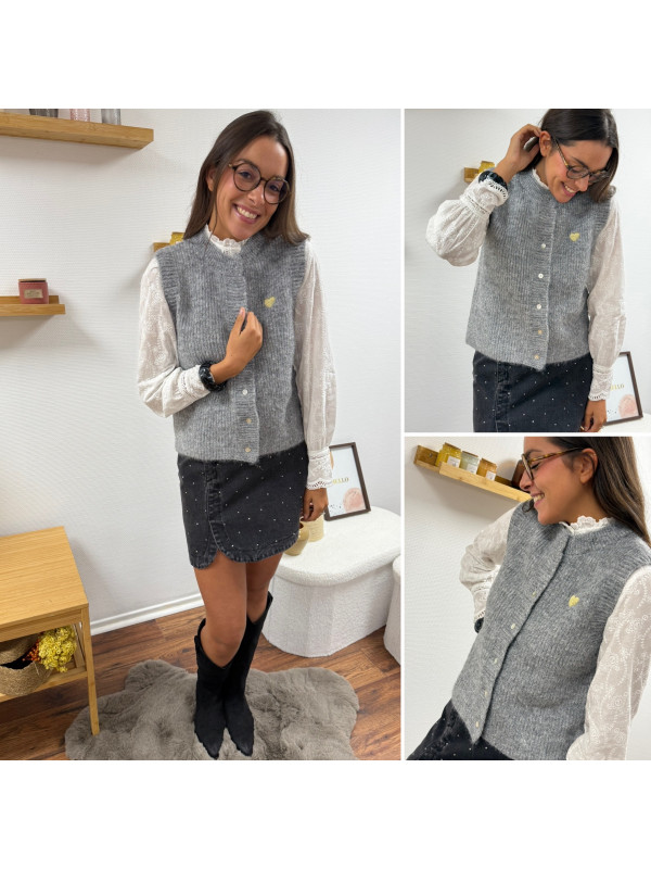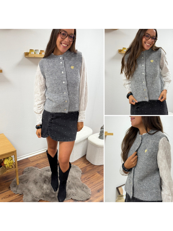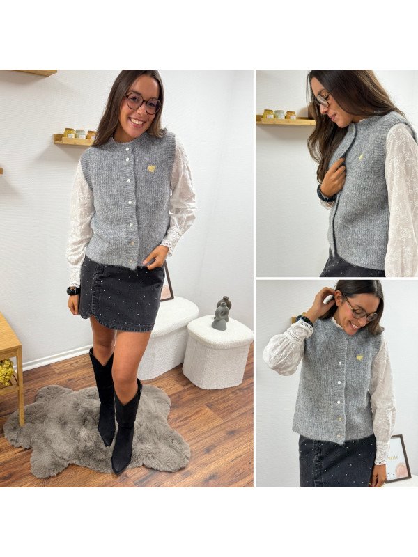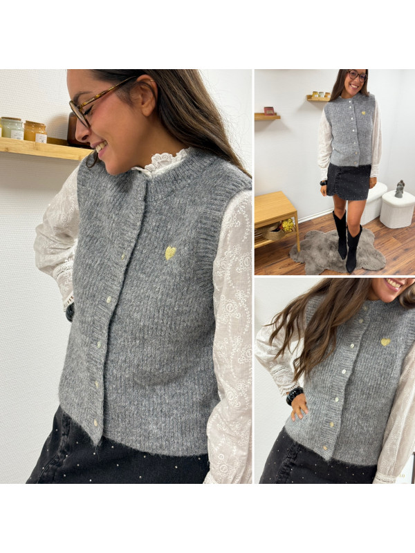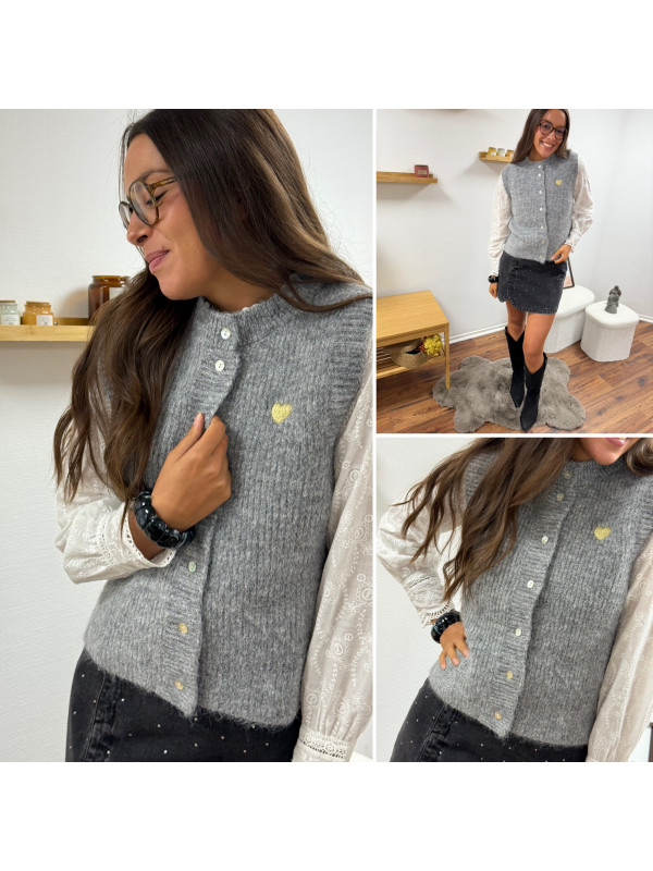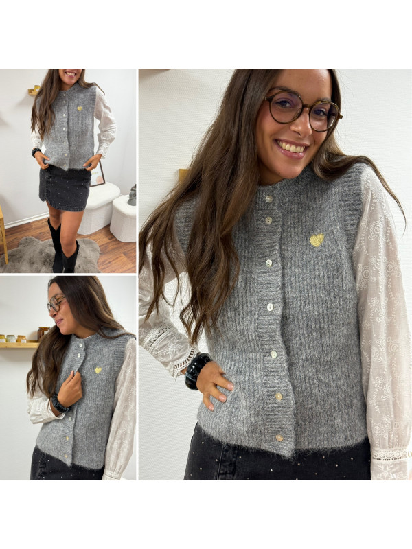 Gilet sans manches avec coeur doré et boutons nacrés gris chiné