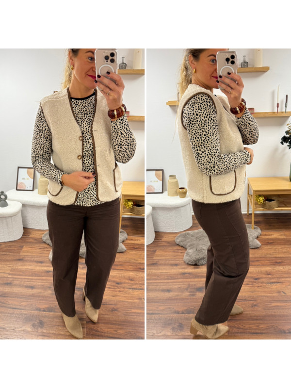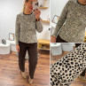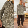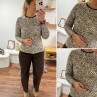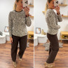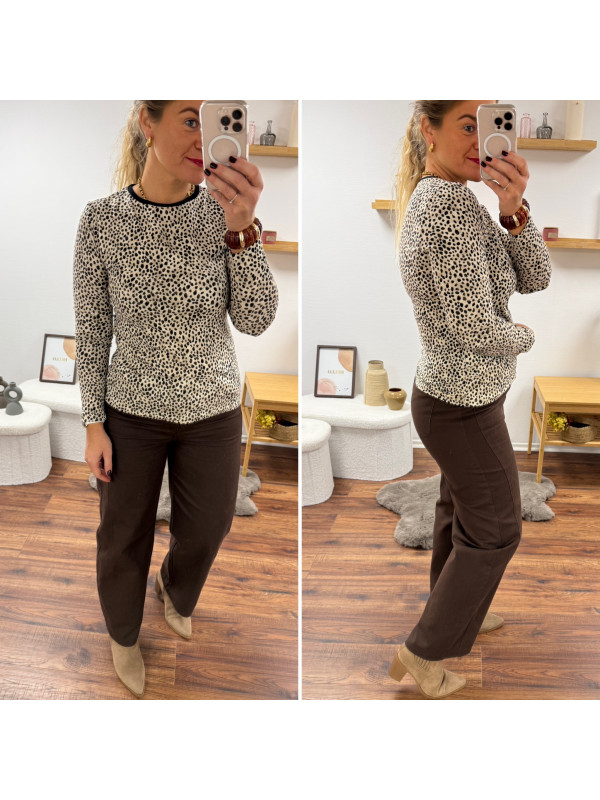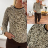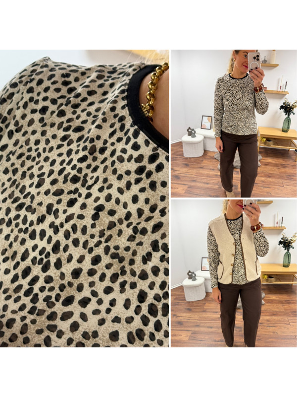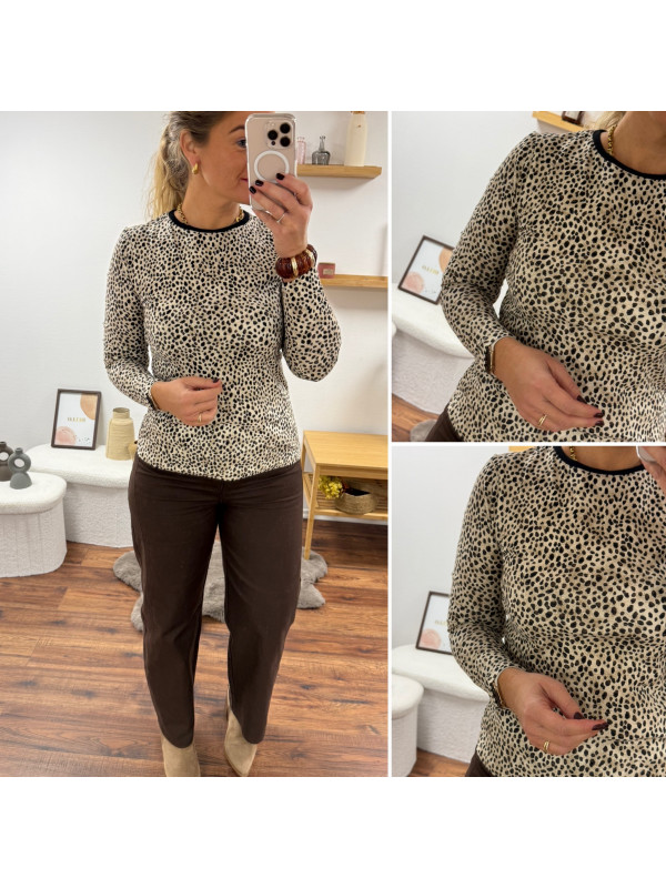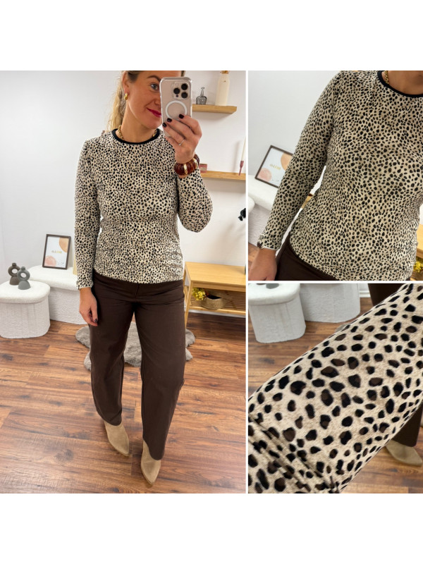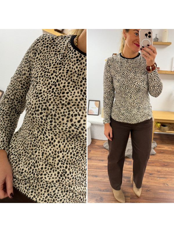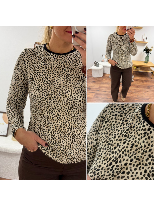 Tee shirt manches longues beige avec petit léopard chocolat (du 36 au 46)