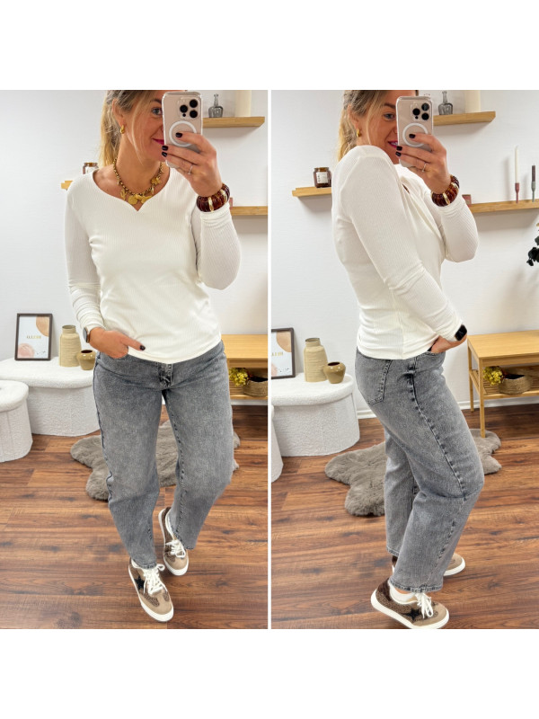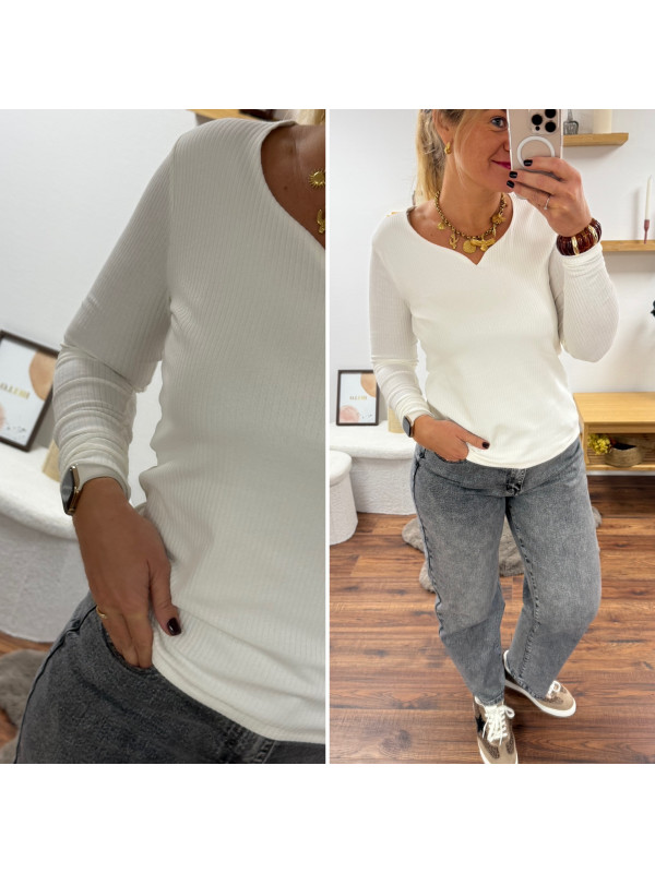 Tee shirt blanc manches longues tissu côtelé décolleté en forme de coeur