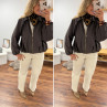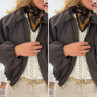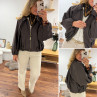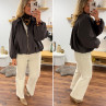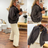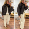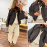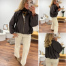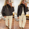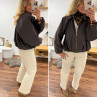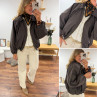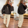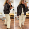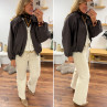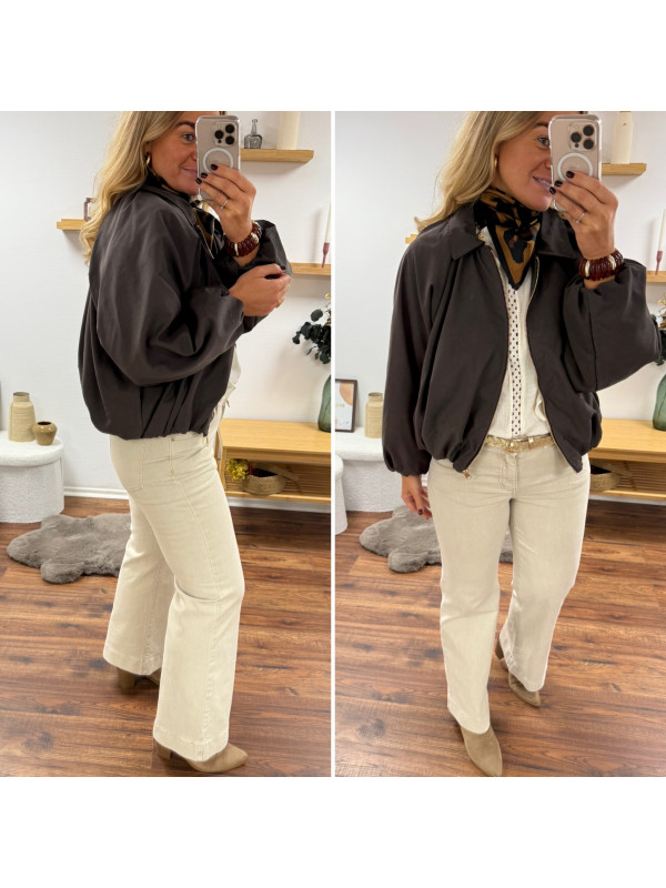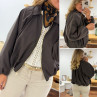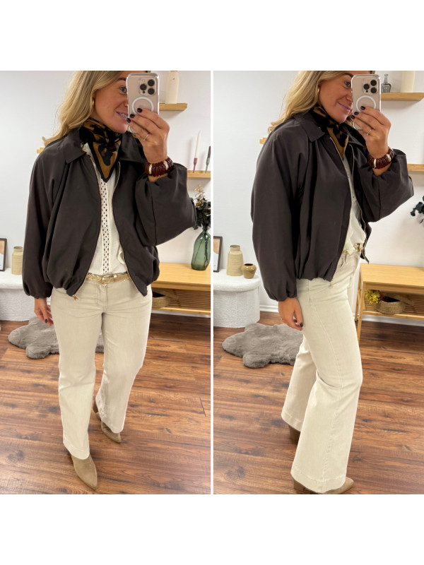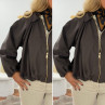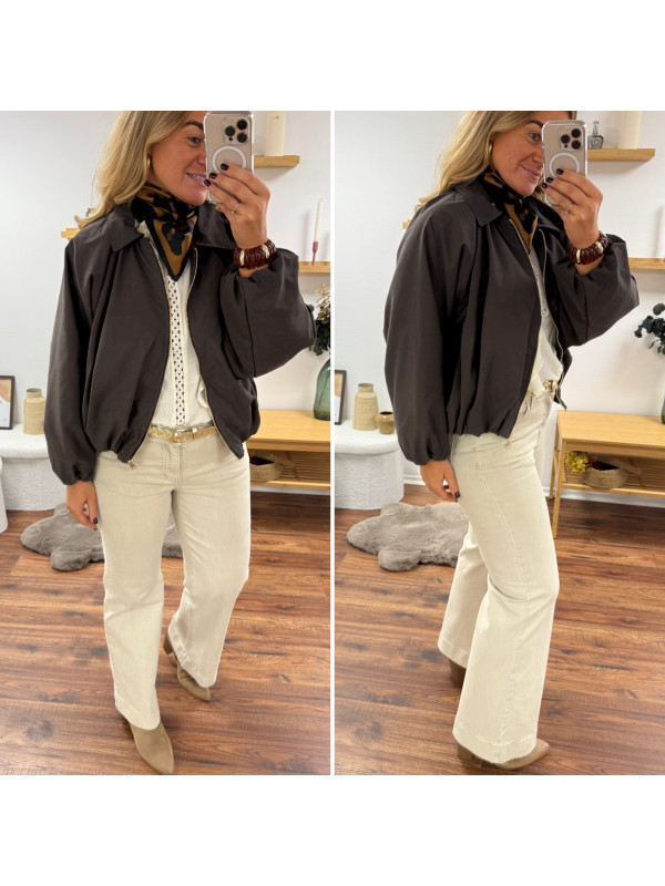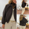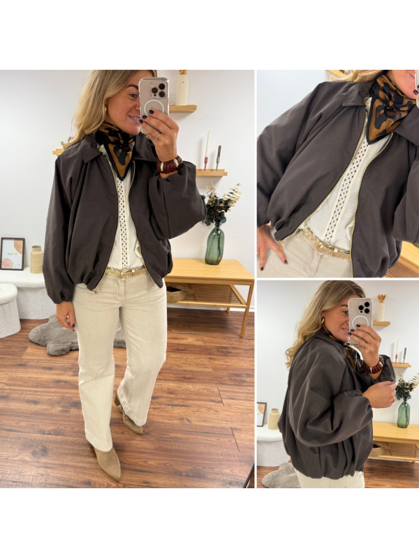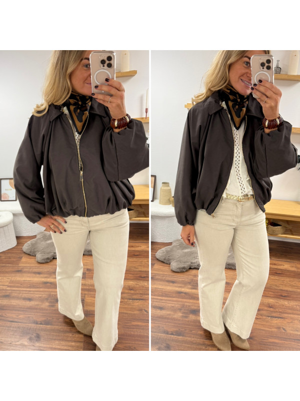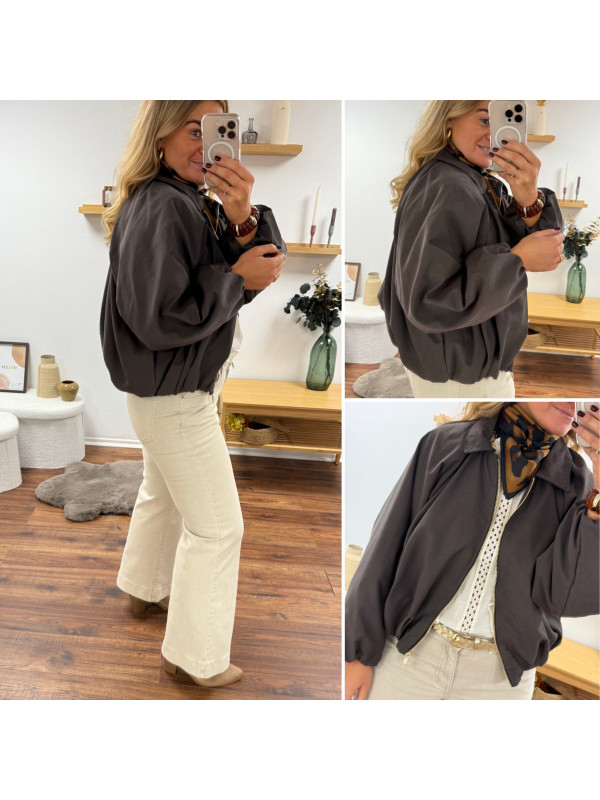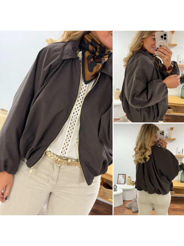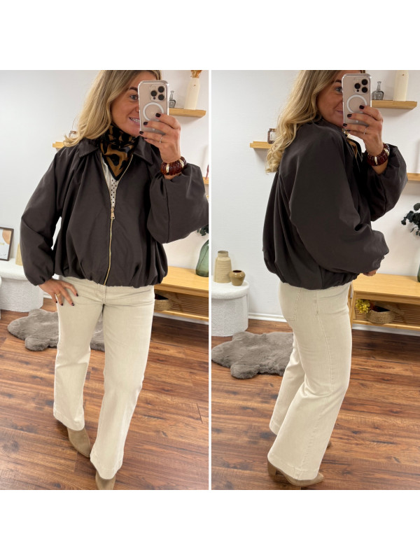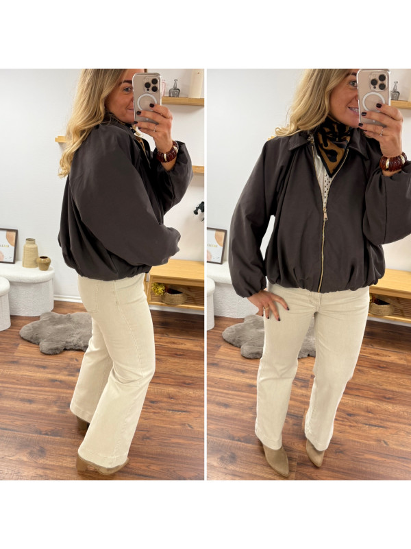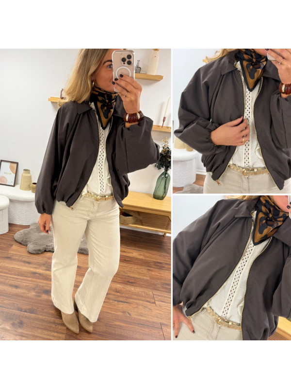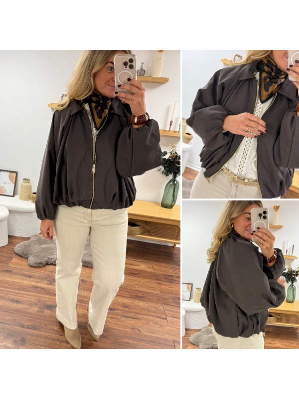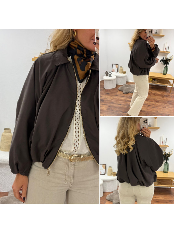 Veste chocolat resserrée et froncée en bas et aux manches tissu peau de pêche