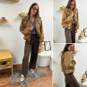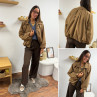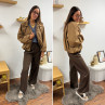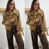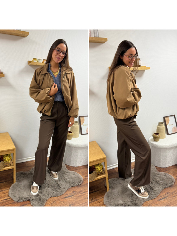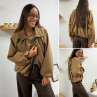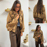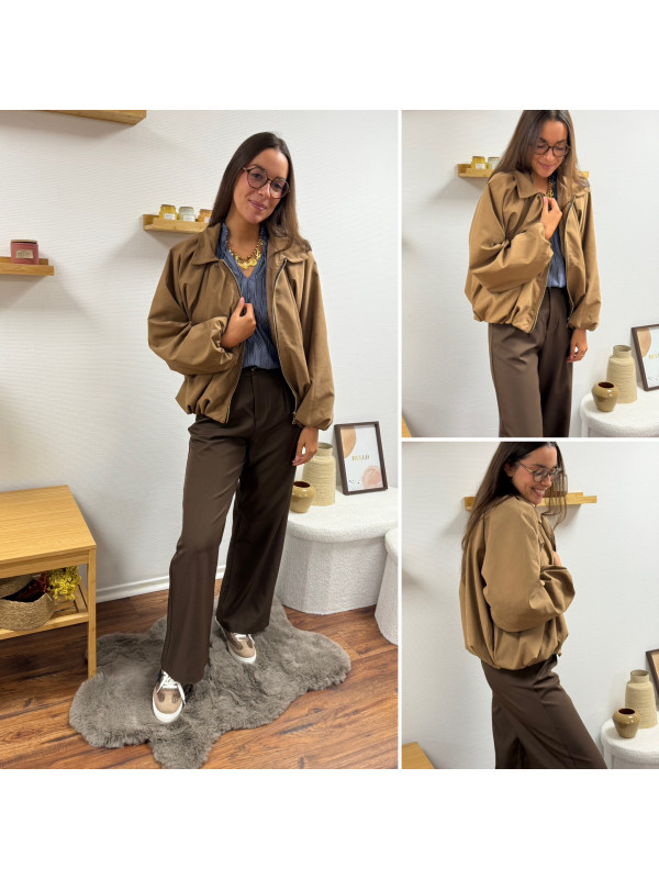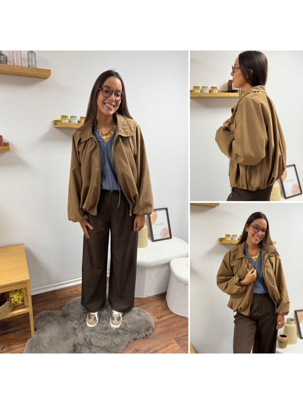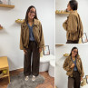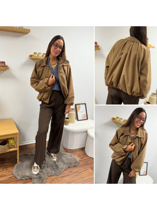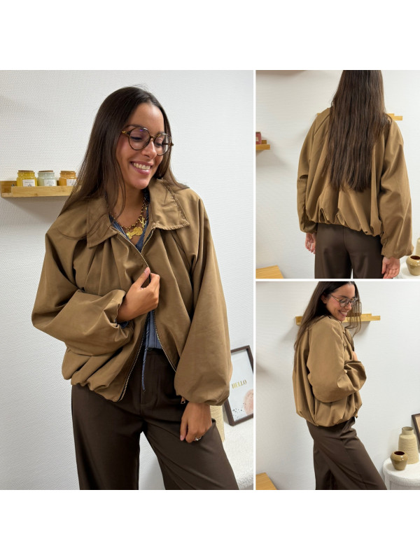 Veste camel resserrée et froncée en bas et aux manches tissu effet peau de pêche