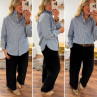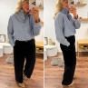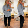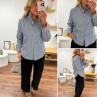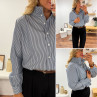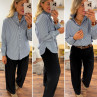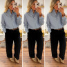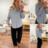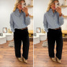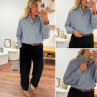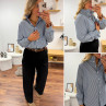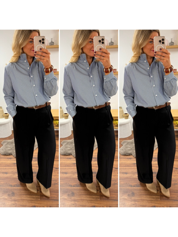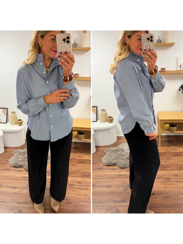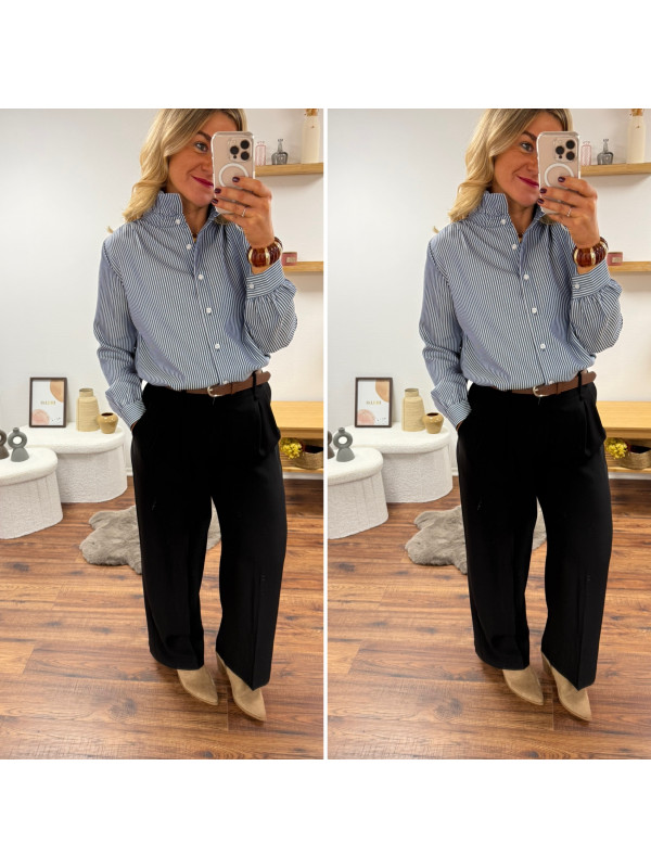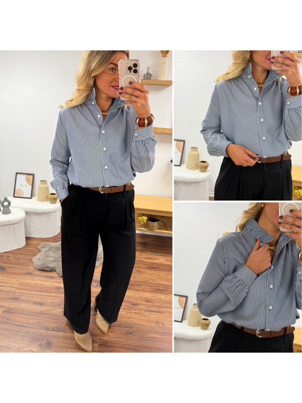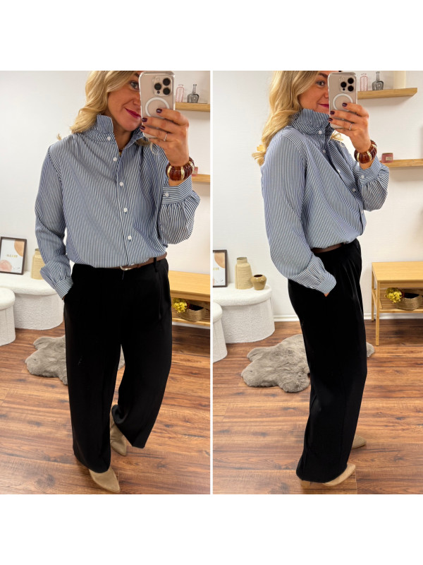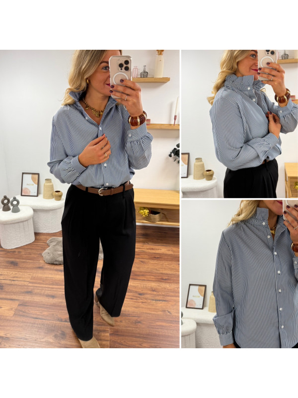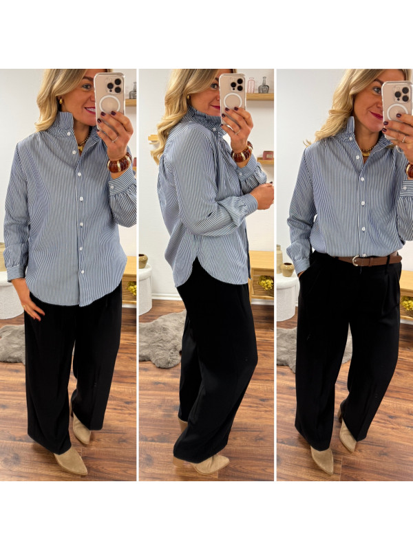 Blouse bleue foncée avec fines rayures blanches et col volant
