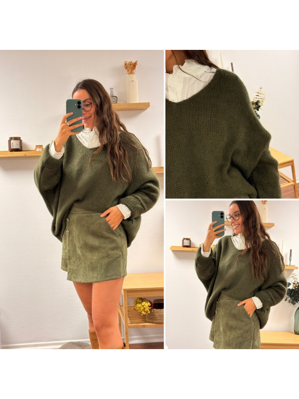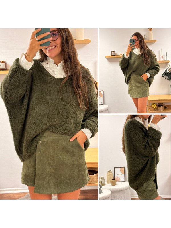 Pull kaki oversize avec col V manches chauve souris