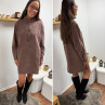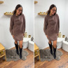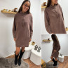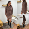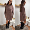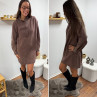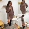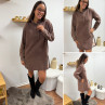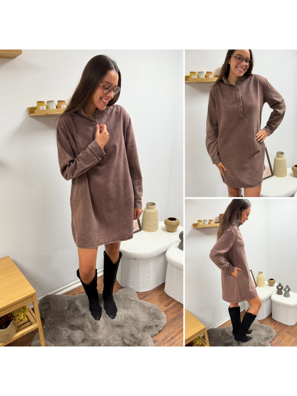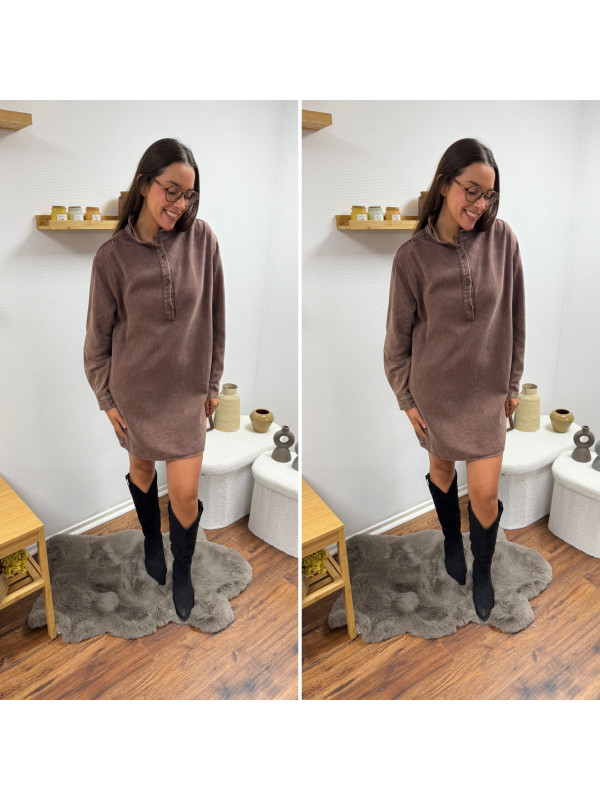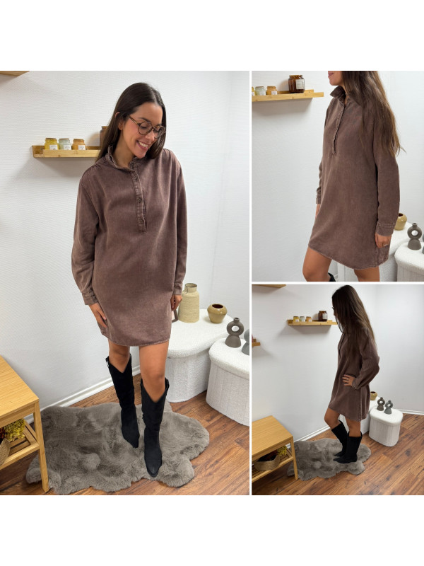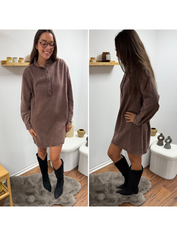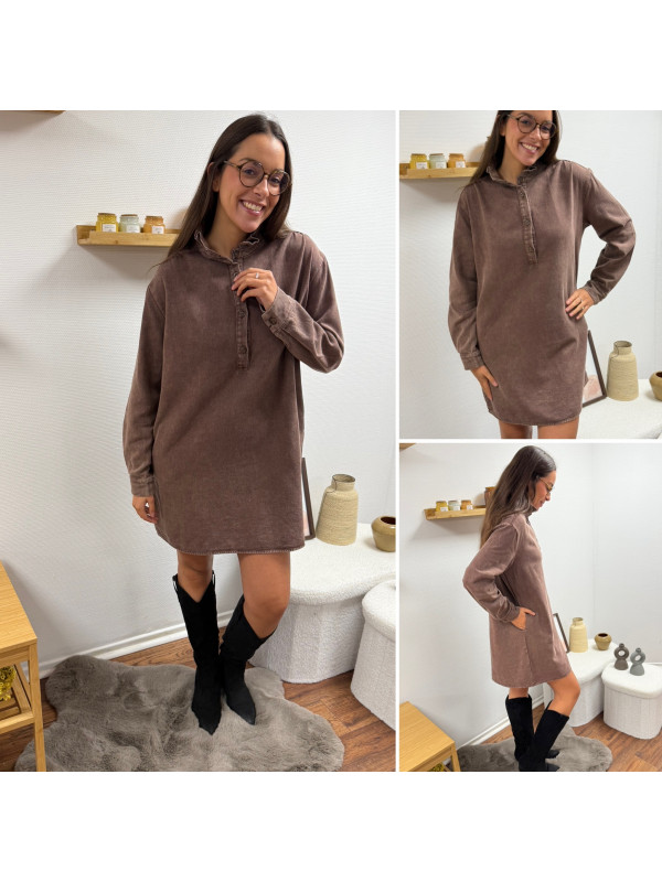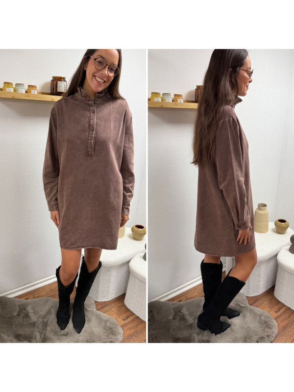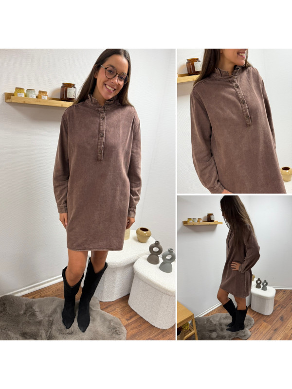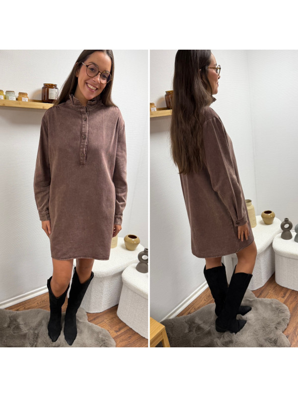 Robe courte en toile de jean couleur chocolat avec volant sur le col