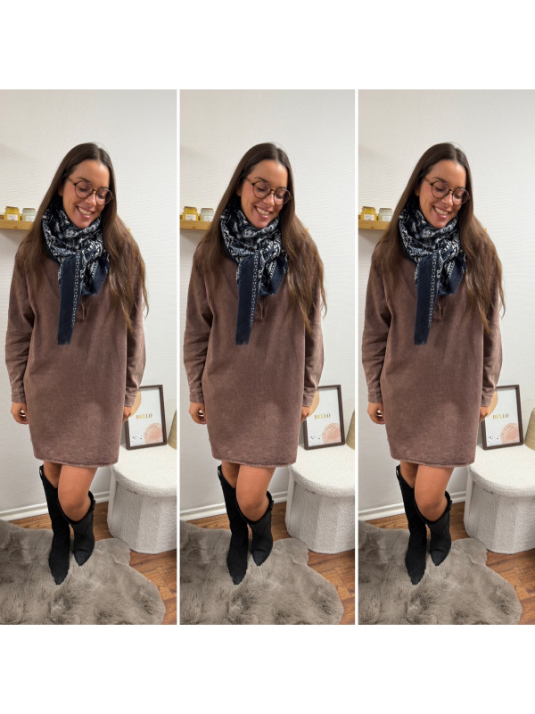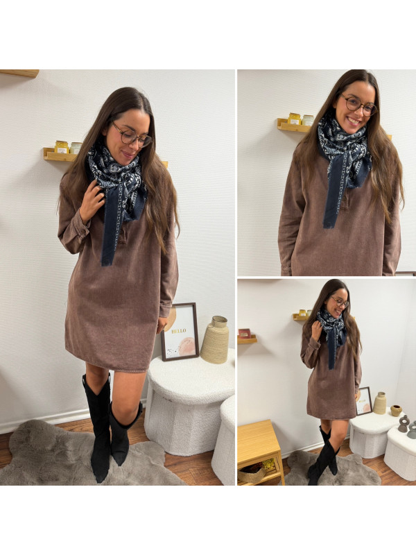 Robe courte en toile de jean couleur chocolat avec volant sur...