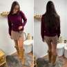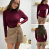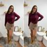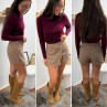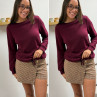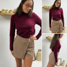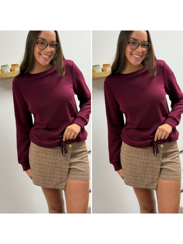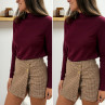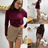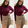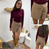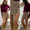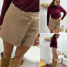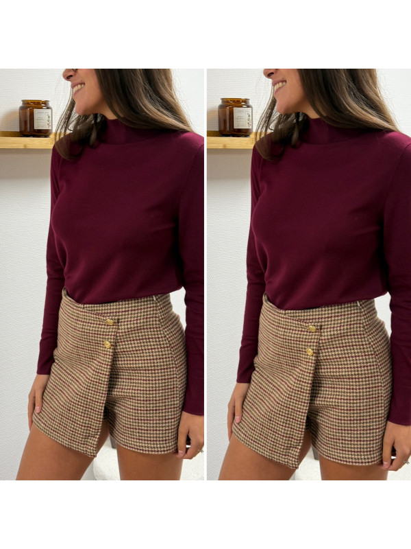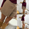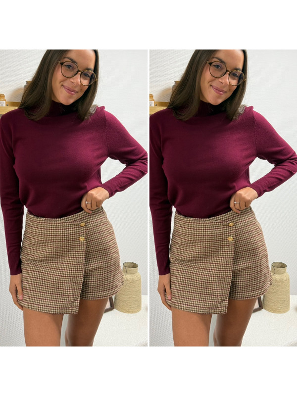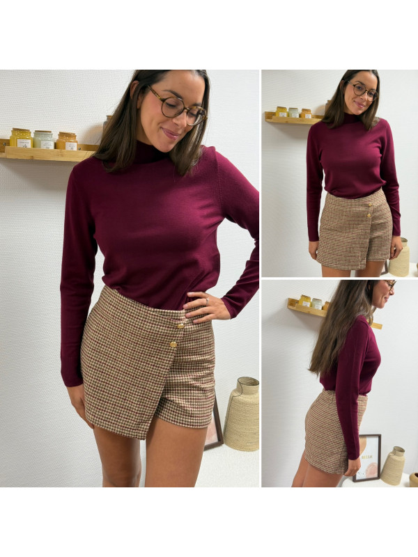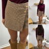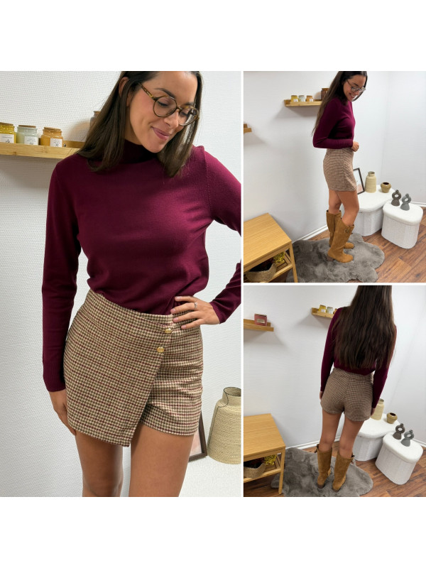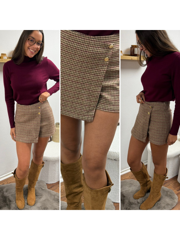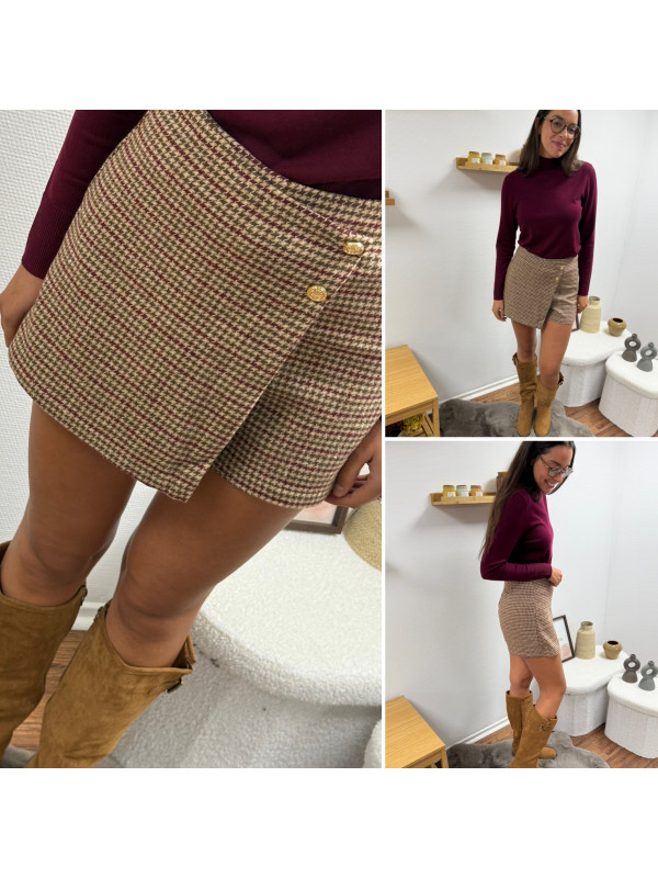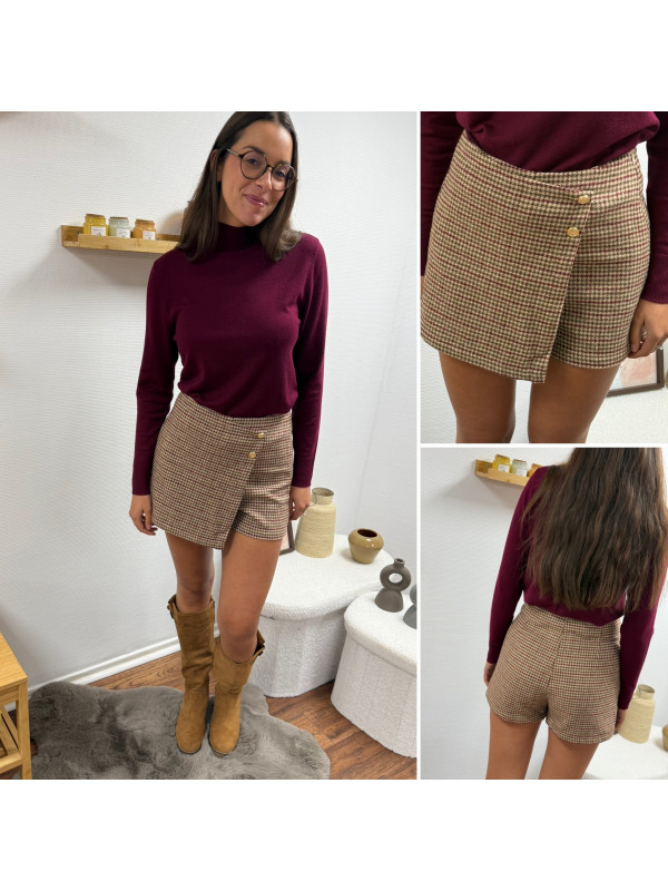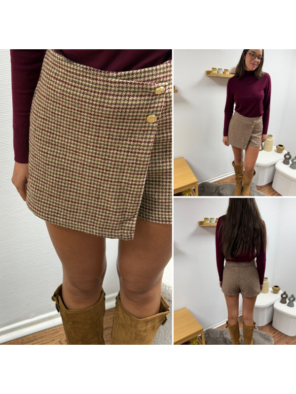 Jupe short beige à petits carreaux bordeaux avec pan et boutons dorés