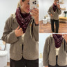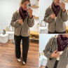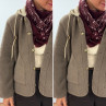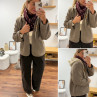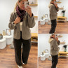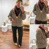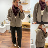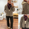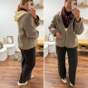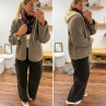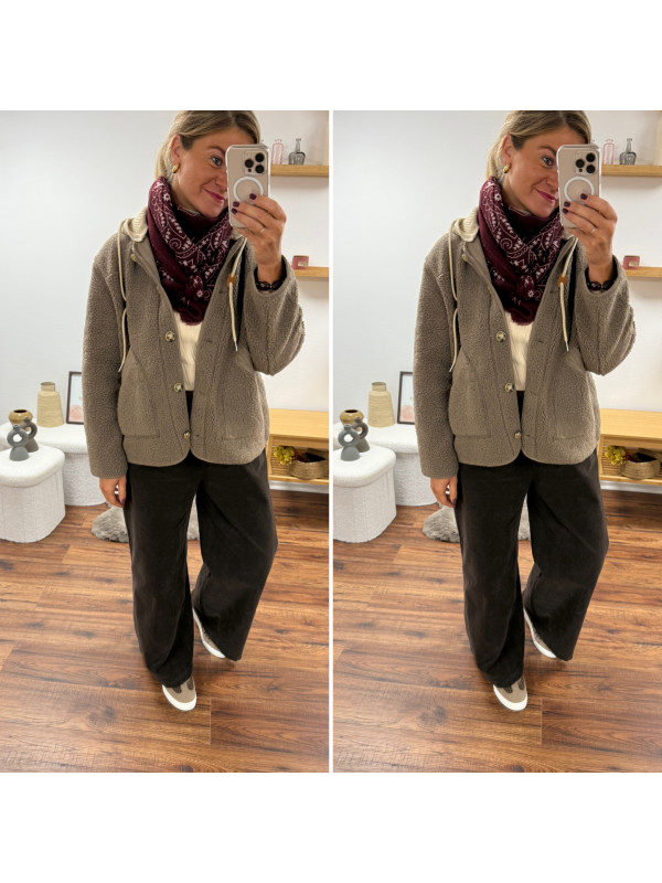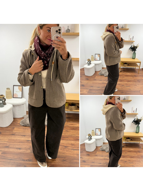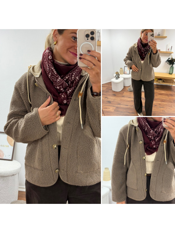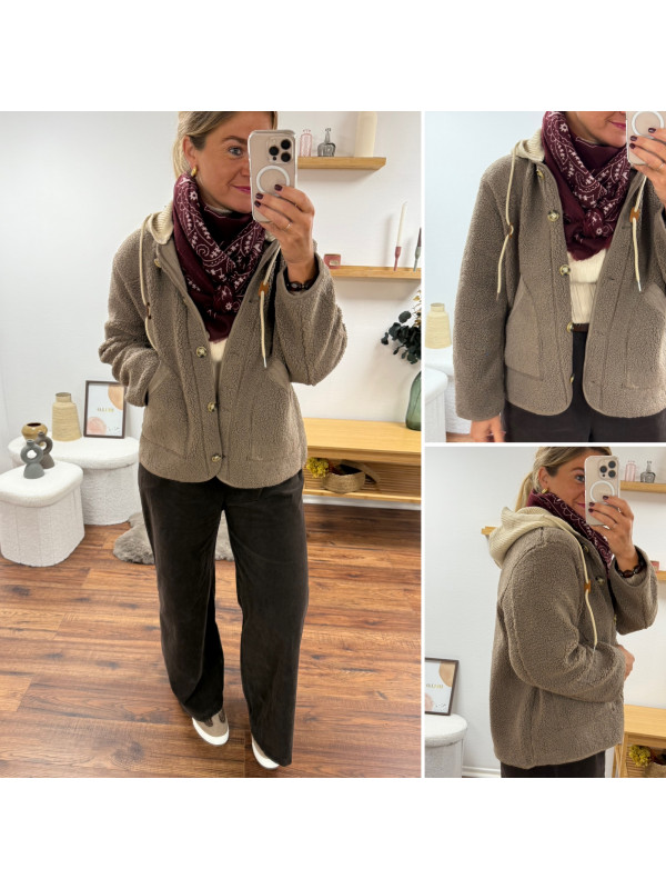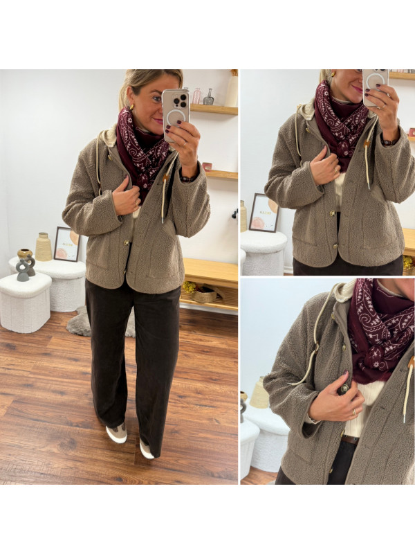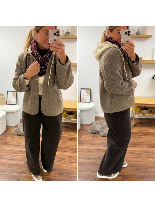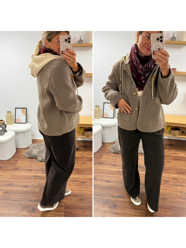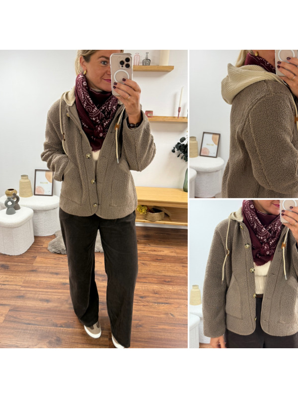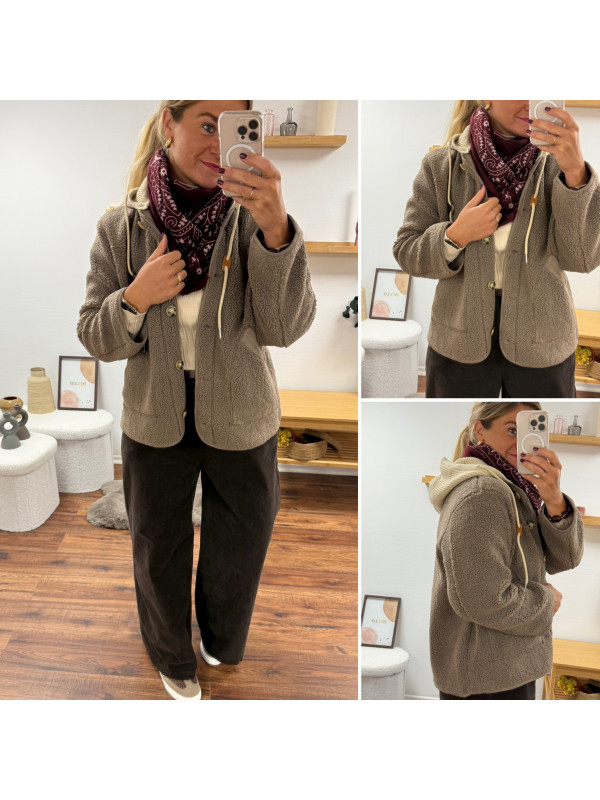 Veste à bouclettes taupe avec capuche en maille écrue amovible
