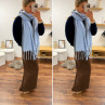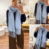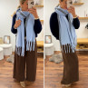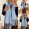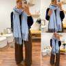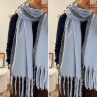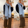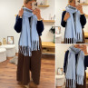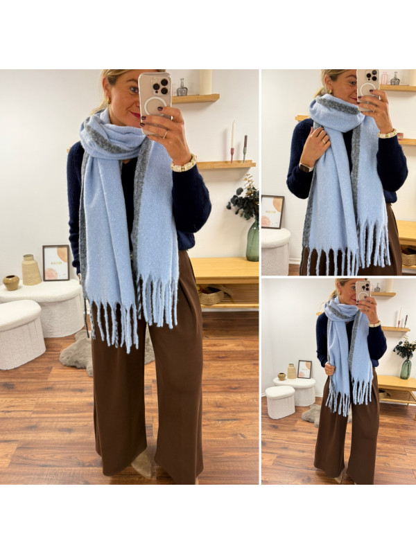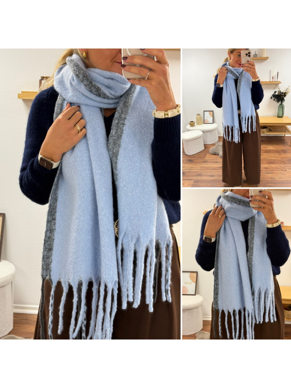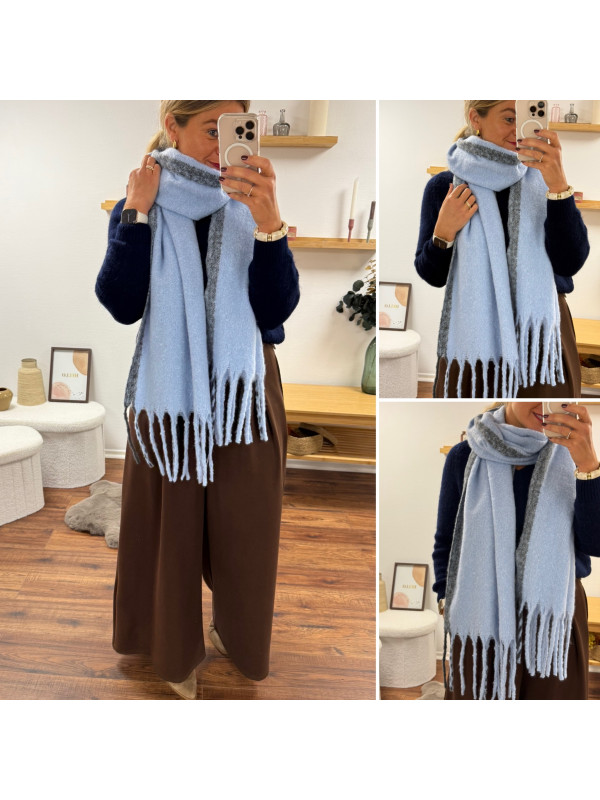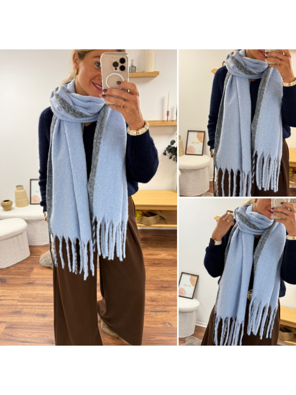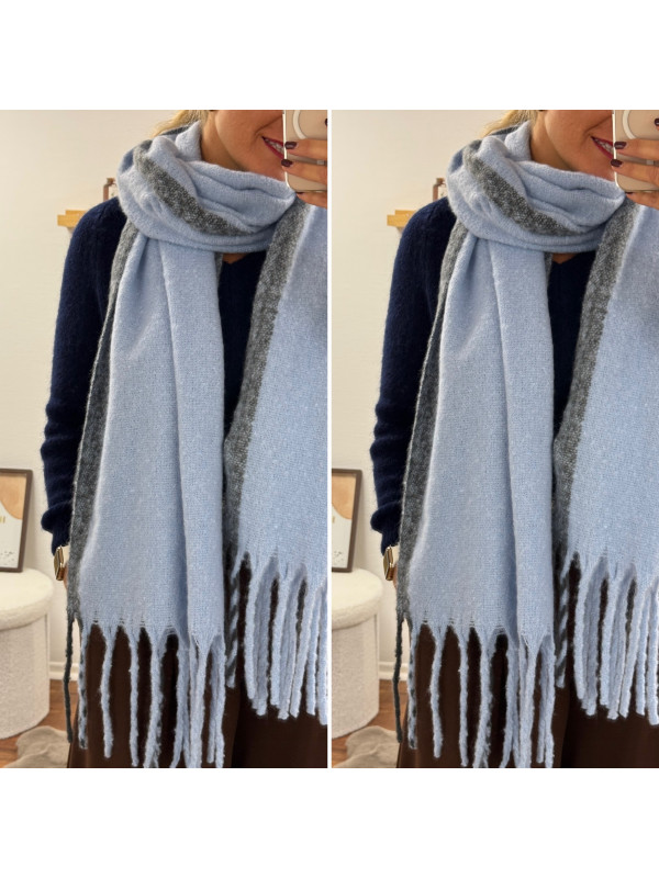 Grosse écharpe bleu clair toute douce avec bord gris et franges