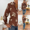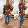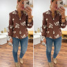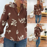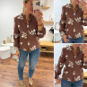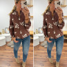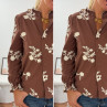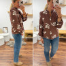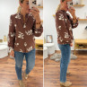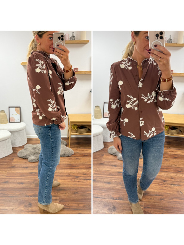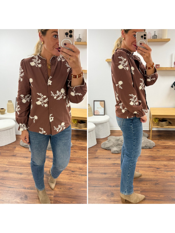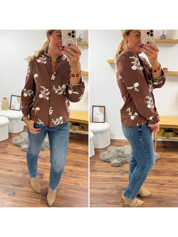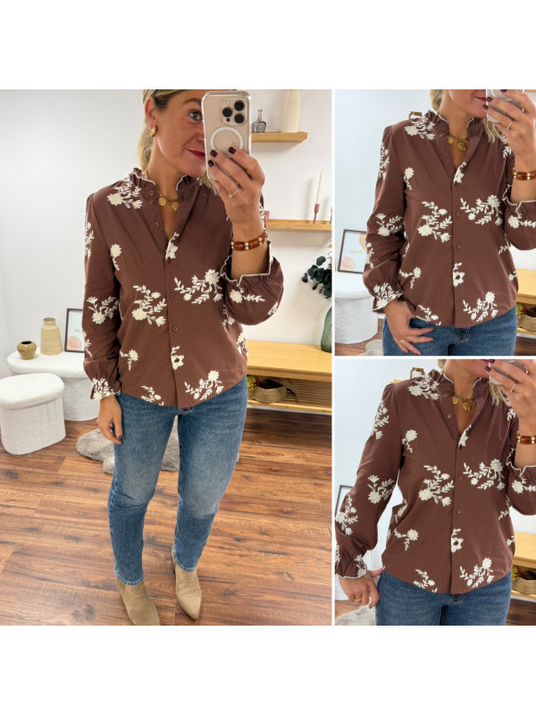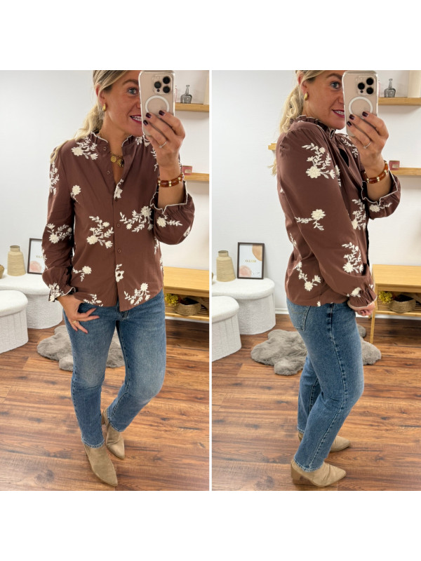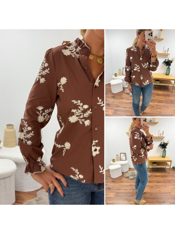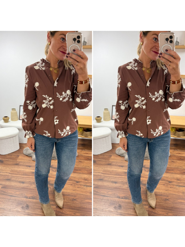 Chemise marron noisette avec broderies fleuries blanches et col volant