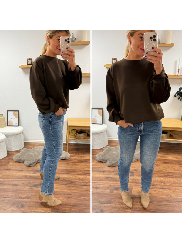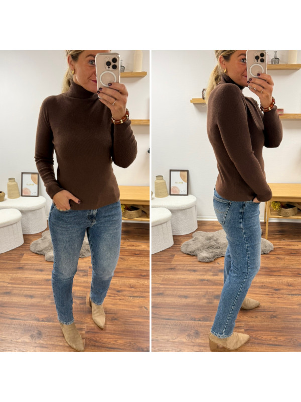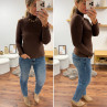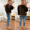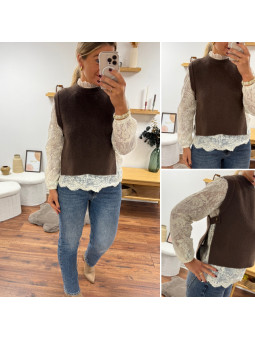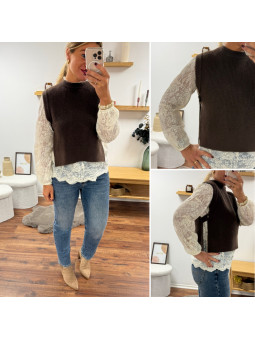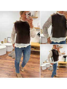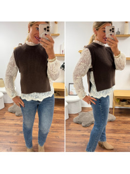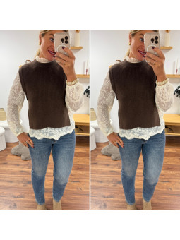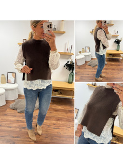 Pull sans manches chocolat ouvert avec bouton sur le côté Cet...