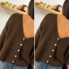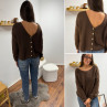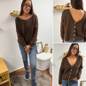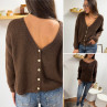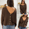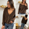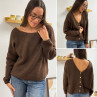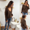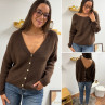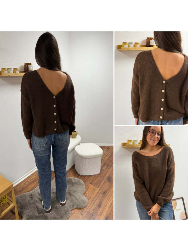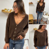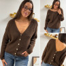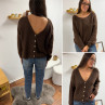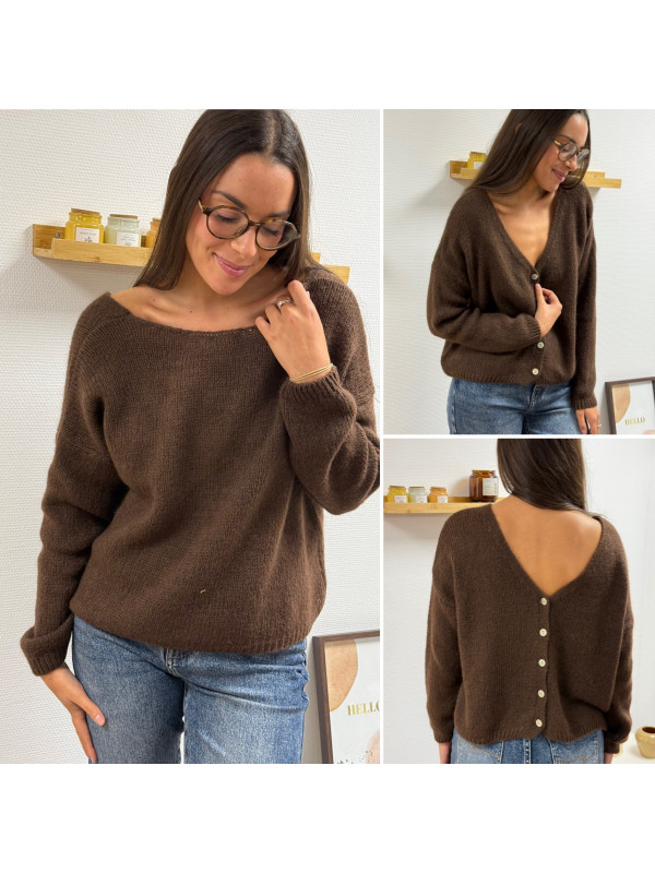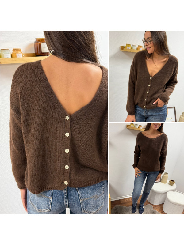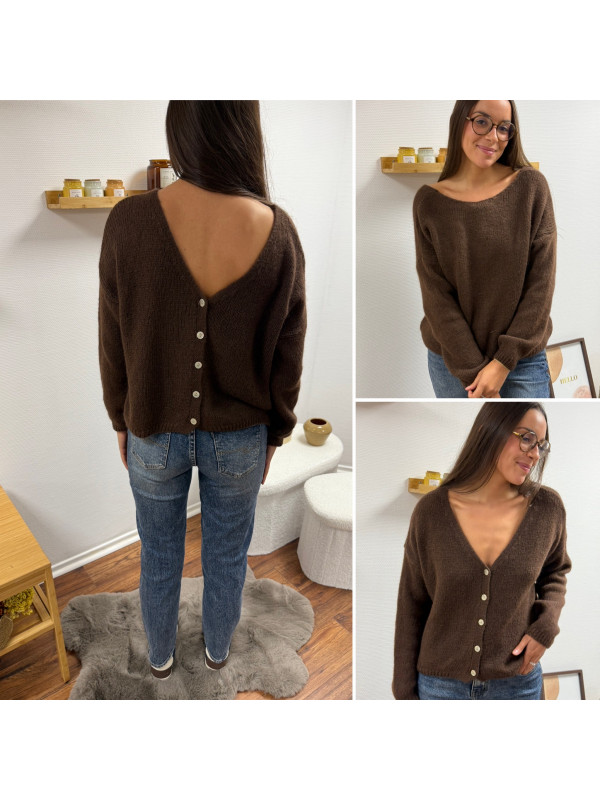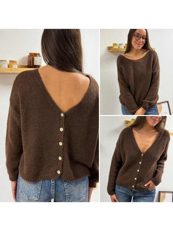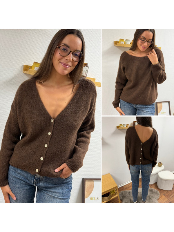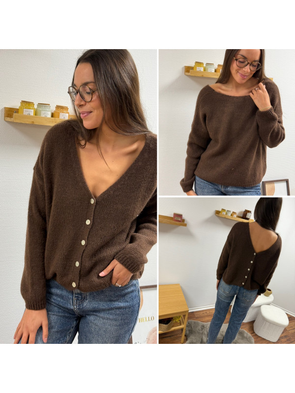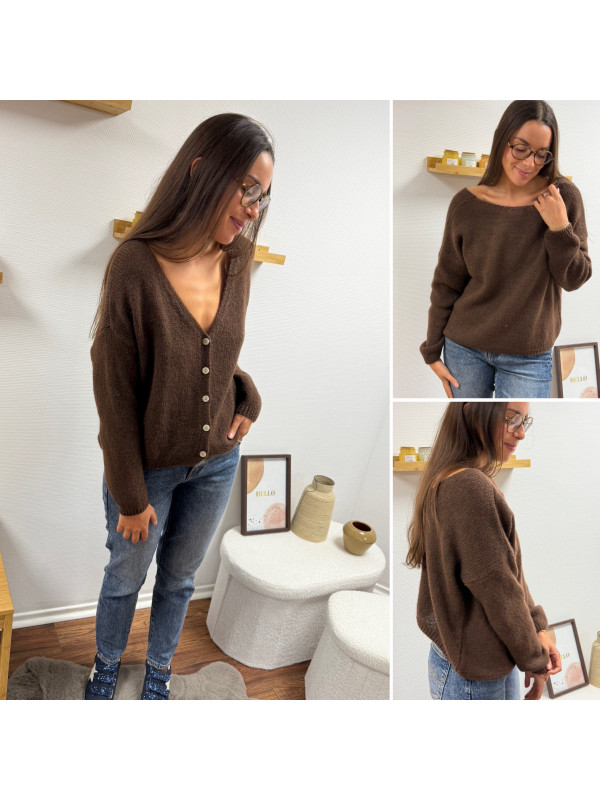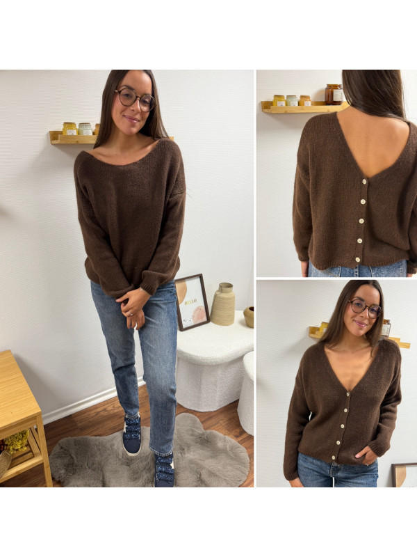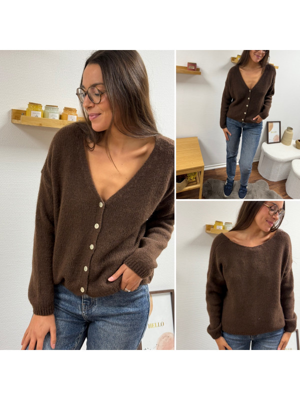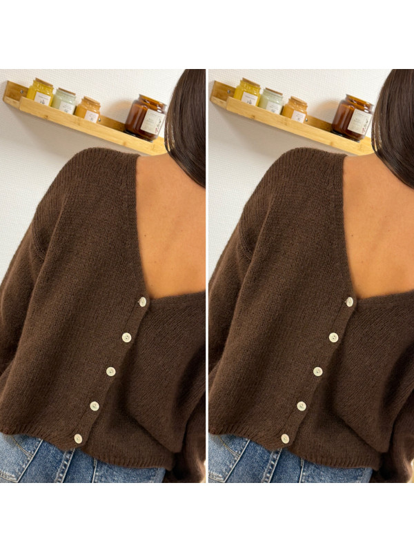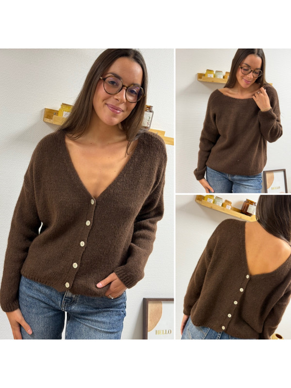 Gilet en mohair col V chocolat avec boutons nacrés à porter avec le V devant ou dans le dos