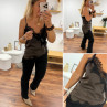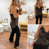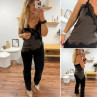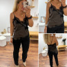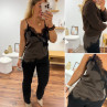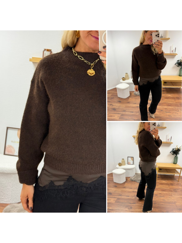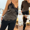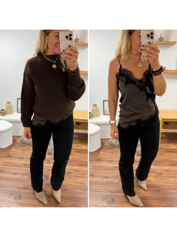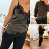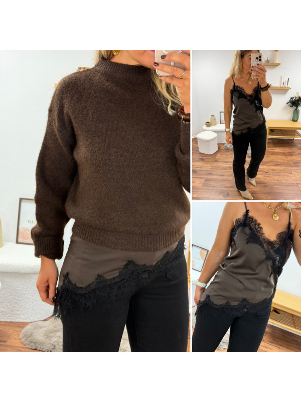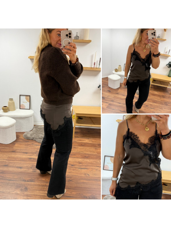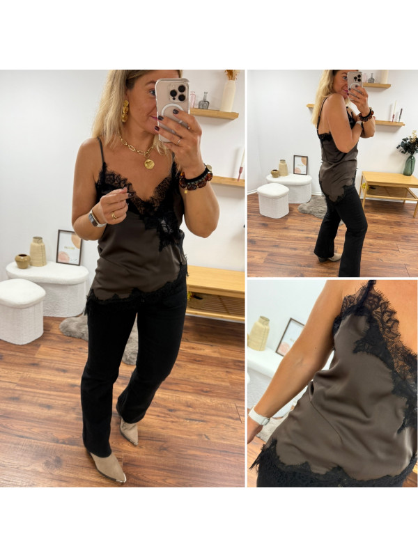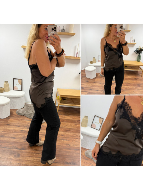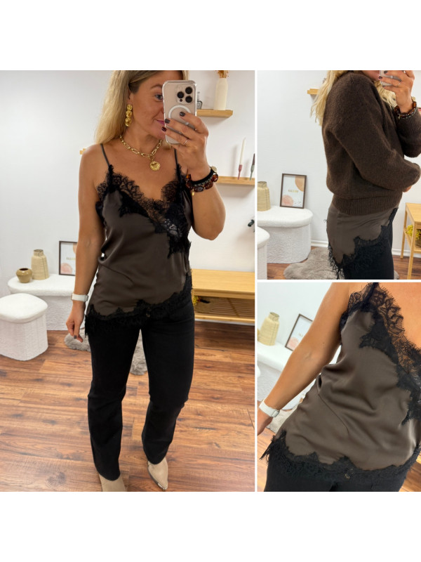 Top chocolat en satin et dentelle asymétrique dans le bas