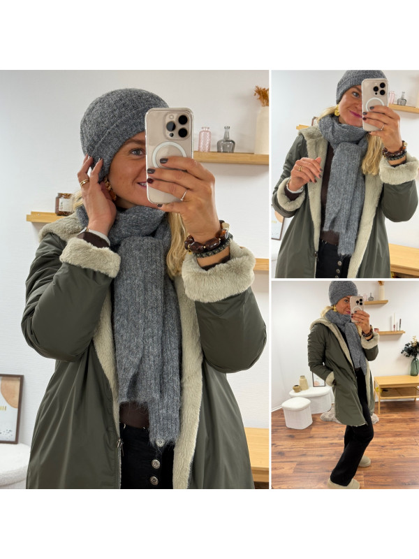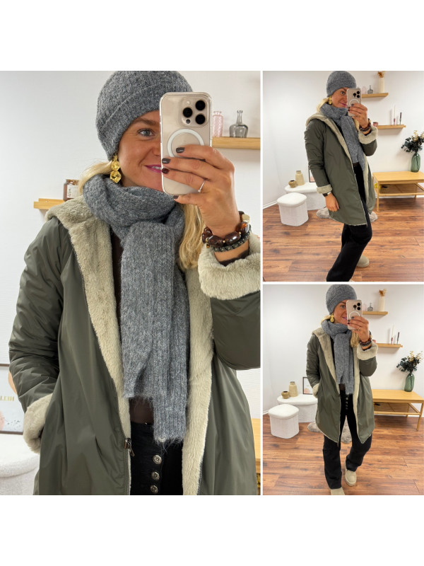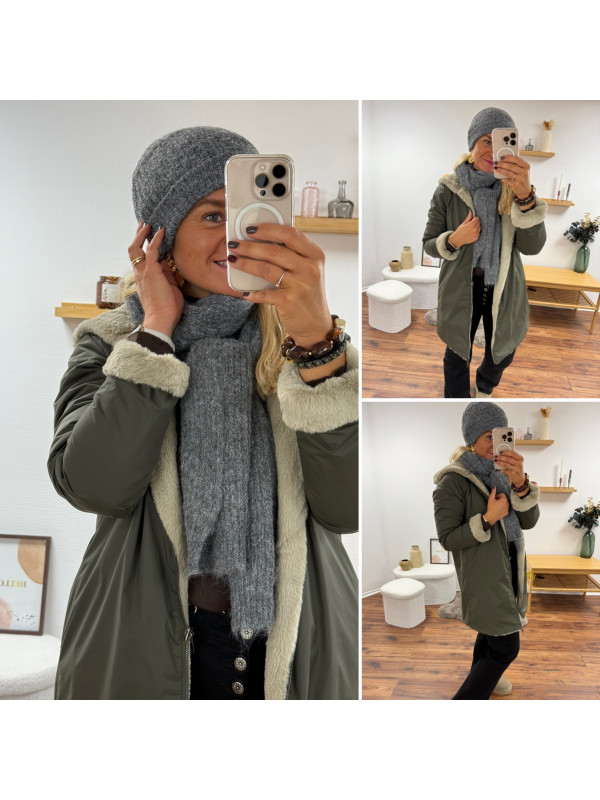 Parka mi longue réversible kaki et fausse fourrure beige Le S...