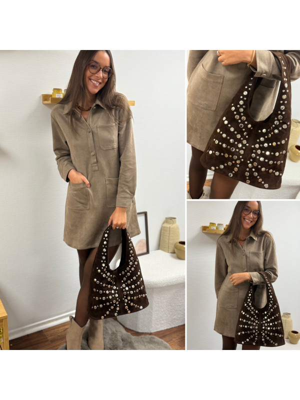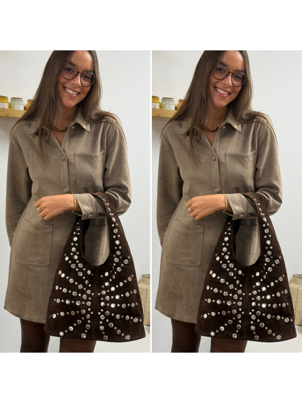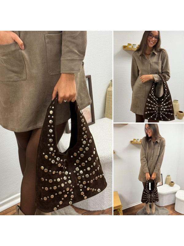 Sac en daim chocolat avec clous argentés (dispo uniquement en boutique)